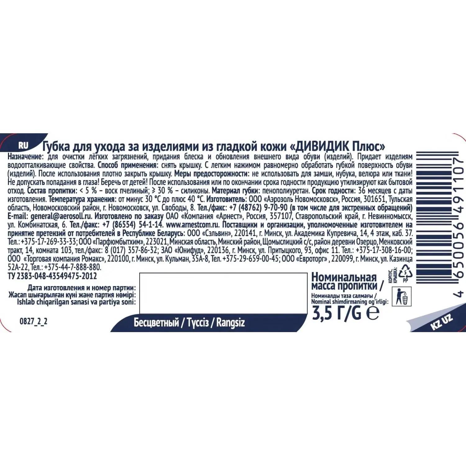 <p>Губка для обуви «Дивидик Плюс» бесцветная очищает, обновляет цвет, придает естественный блеск изделиям из гладкой кожи. Обеспечивает до 35 качественных чисток. Пропитка в губке распределяется точечным образом в концентрированном виде. Нет жирности при первой чистке, экономичный расход вещества.</p>