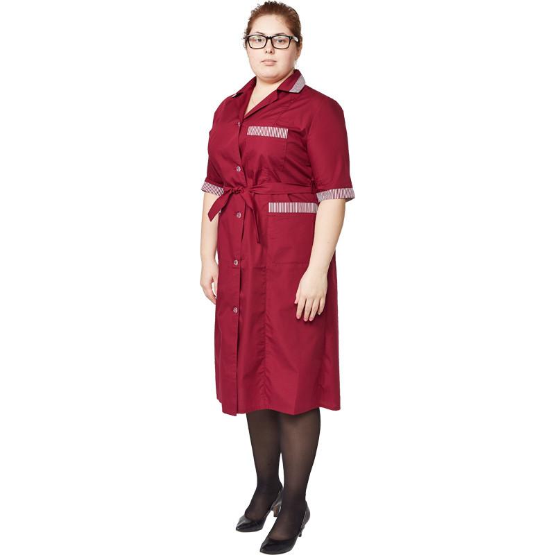 <p>Женский халат для горничных и уборщиц у01-ХЛ размер 44-46, рост 158-164 см. Изготовлен из смесовой ткани Ти-Си, цвет бордовый (темно-красный), состав — 65% полиэфира и 35% хлопка (плотность 120 г/кв.м.). Ти-Си — материал, приятный на ощупь, гигиеничен и долговечен. Не мнется, легко и быстро стирается, быстро сохнет. Долго сохраняет свой первоначальный яркий цвет. Ткань «дышит», благодаря входящему в состав хлопку, имеет повышенный срок службы и проста в уходе, благодаря полиэфиру. Рукав короткий. Воротник отложной с лацканами, есть накладные карманы. Отлет воротника, верхние части карманов и края рукавов отделаны светлой тканью. Халат застегивается на пуговицы. Униформа рекомендована для сферы обслуживания, клининга, гостиничного бизнеса.</p><BR><!--noindex-->Также в коллекции униформы для горничных и уборщиц у01 представлены халаты у01-ХЛ в бордовом цвете с длинным рукавом. Цветовая гамма коллекции дополнительно представлена цветами бирюзовый и васильковый, моделями халатов с длинным и коротки рукавами.<!--/noindex-->