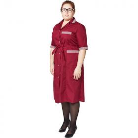 <p>Женский халат для горничных и уборщиц у01-ХЛ размер 48-50, рост 158-164 см. Изготовлен из смесовой ткани Ти-Си, цвет бордовый (темно-красный), состав — 65% полиэфира и 35% хлопка (плотность 120 г/кв.м.). Ти-Си — материал, приятный на ощупь, гигиеничен и долговечен. Не мнется, легко и быстро стирается, быстро сохнет. Долго сохраняет свой первоначальный яркий цвет. Ткань «дышит», благодаря входящему в состав хлопку, имеет повышенный срок службы и проста в уходе, благодаря полиэфиру. Рукав короткий. Воротник отложной с лацканами, есть накладные карманы. Отлет воротника, верхние части карманов и края рукавов отделаны светлой тканью. Халат застегивается на пуговицы. Униформа рекомендована для сферы обслуживания, клининга, гостиничного бизнеса.</p><BR><!--noindex-->Также в коллекции униформы для горничных и уборщиц у01 представлены халаты у01-ХЛ в бордовом цвете с длинным рукавом. Цветовая гамма коллекции дополнительно представлена цветами бирюзовый и васильковый, моделями халатов с длинным и коротки рукавами.<!--/noindex-->