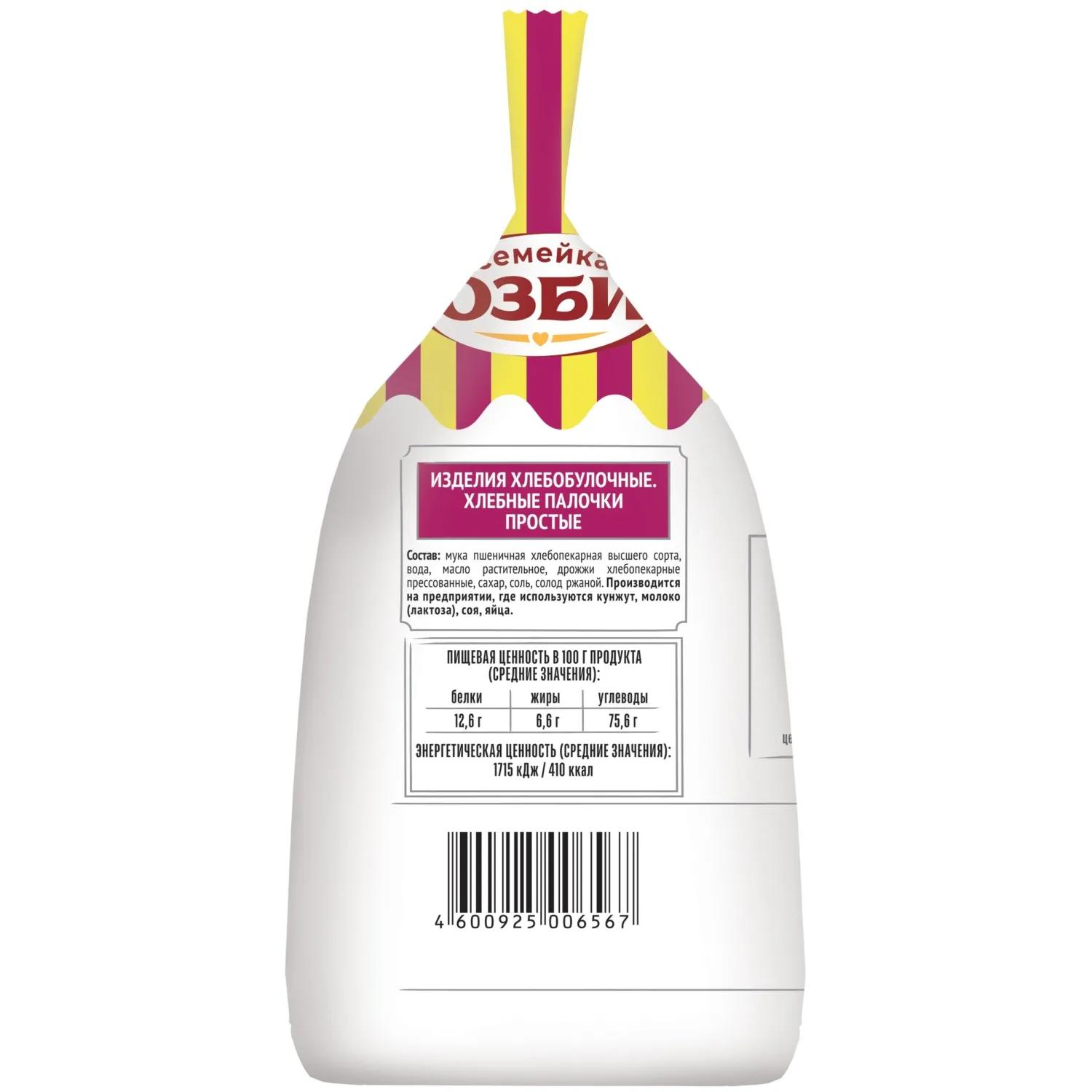 Хлебные палочки Семейка ОЗБИ 150 г (10 штук в упаковке)<br><br>Состав: мука пшеничная хлебопекарная высшего сорта, вода, масло растительное, дрожжи хлебопекарные прессованные, сахар, соль, солод ржаной. Производится на предприятии, где используются кунжут, молоко (в том числе лактоза), соя, яйца. <br>Пищевая ценность: белки — 12,6 г; жиры — 6,6 г; углеводы — 75,6 г.<br>Энергетическая ценность: 1715 кДж/410 ккал.<br>Срок хранения 180 суток. <br>Хранить в хорошо проветриваемых сухих чистых помещениях, не имеющих посторонних запахов, не заражённых вредителями хлебных запасов при температуре 18 С и относительной влажности не более 75 %. <br>Вес: 1500 г.<br>Страна производства: Россия. <br>Производитель: ЗАО "ОЗБИ".
