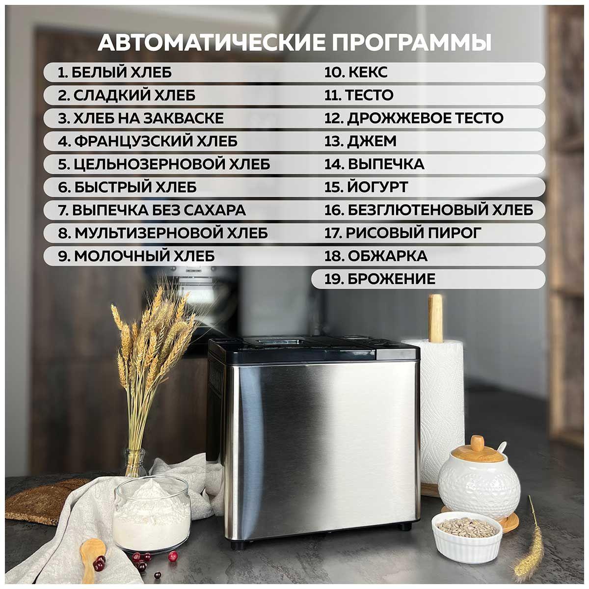 Программы безглютеновый хлеб, варенье/джемы, выпечка/кексы/шарлотки, замес теста, йогурт, пшеничный хлеб, ржаной хлеб, сладкий хлеб, французский хлеб, цельнозерновой хлеб