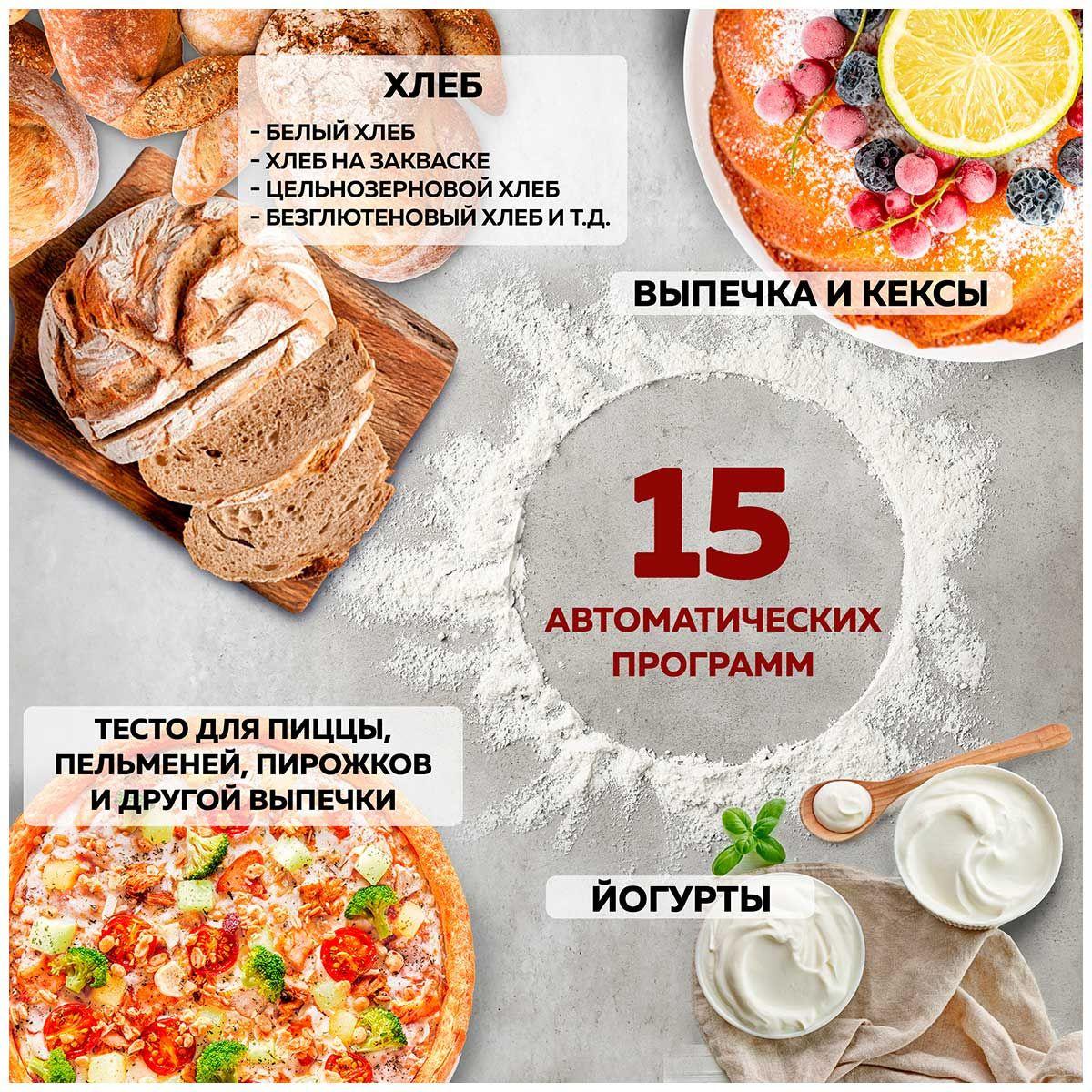 | Программы | безглютеновый хлеб, выпечка/кексы/шарлотки, замес теста, йогурт, пшеничный хлеб, сладкий хлеб, французский хлеб, цельнозерновой хлеб |