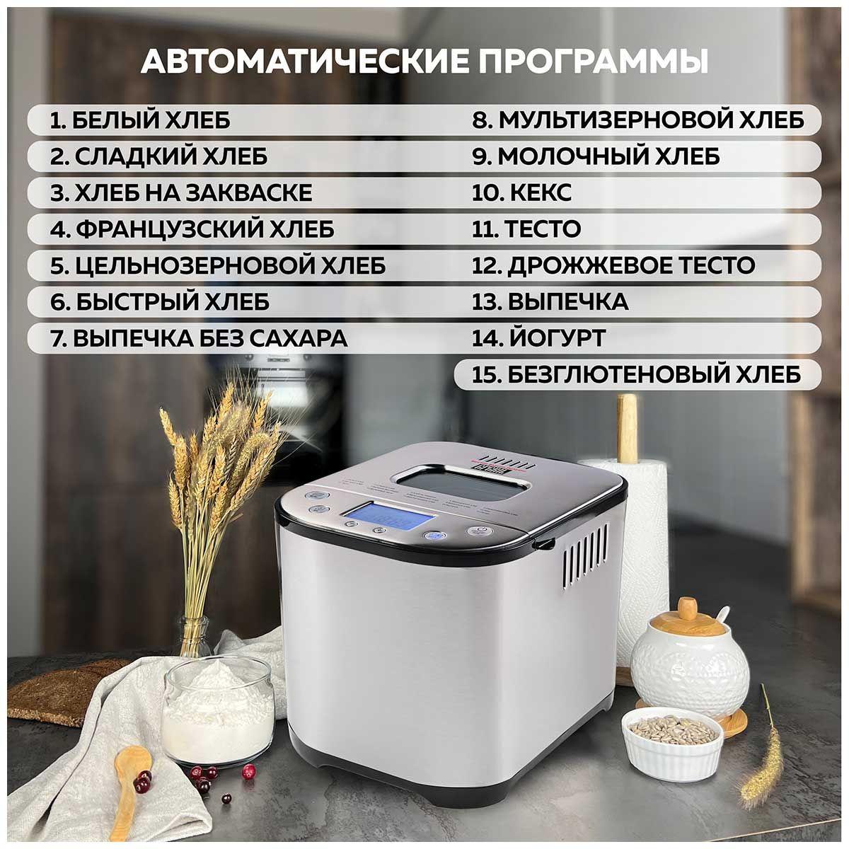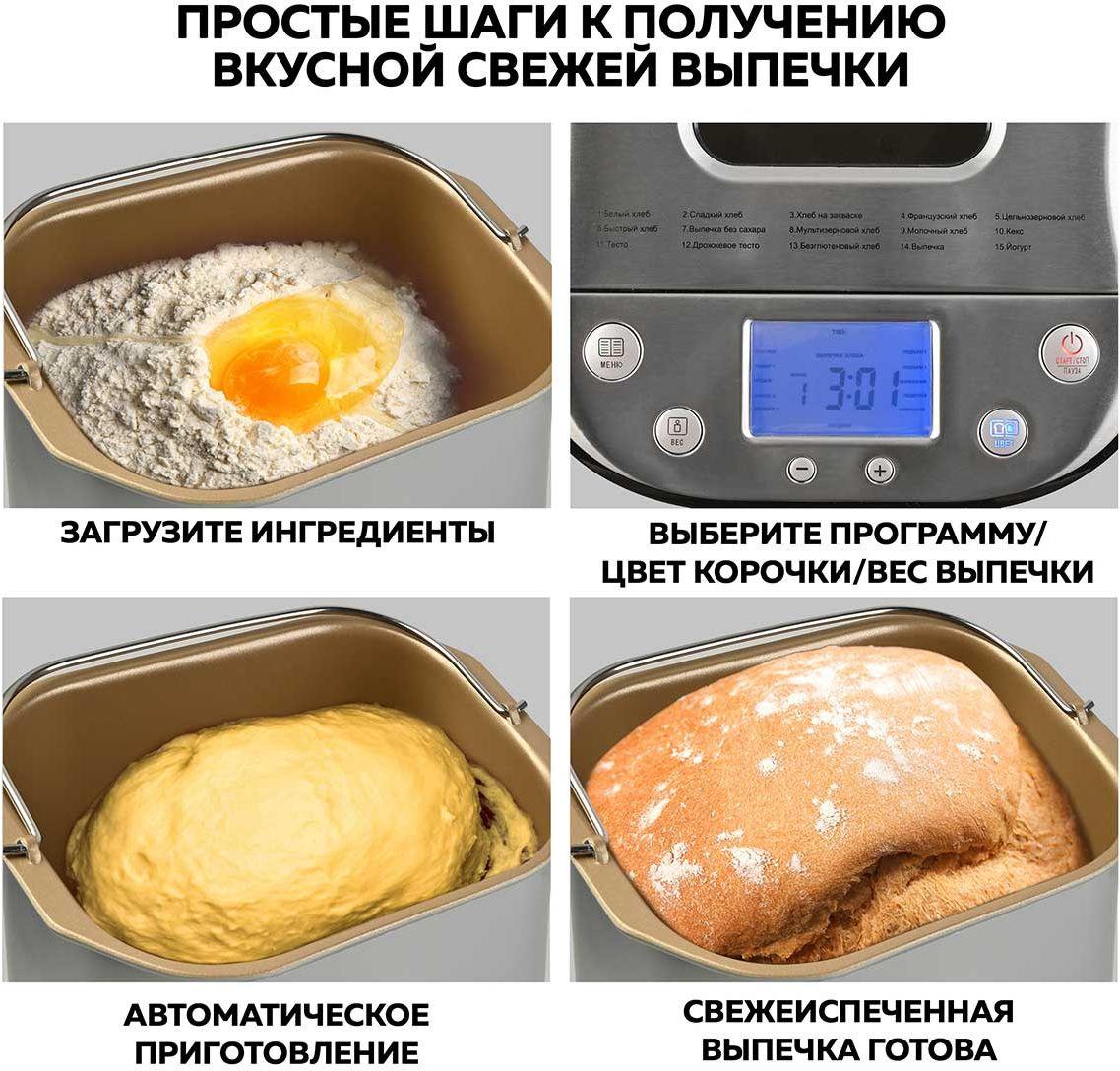 | Программы | безглютеновый хлеб, выпечка/кексы/шарлотки, замес теста, йогурт, пшеничный хлеб, сладкий хлеб, французский хлеб, цельнозерновой хлеб |