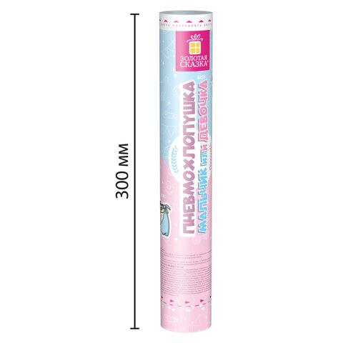 Пневматическая хлопушка не является пиротехникой и работает на основе энергии сжатого воздуха. Конфетти и серпантин ярких цветов можно использовать в помещении или на улице. Хлопушка подойдет для праздников, концертов, реквизита для фотосессии.Хлопушка высотой 30 см с бумажным наполнителем в виде прямоугольников голубого цвета является абсолютно безопасной. Выстрел осуществляется под действием сжатого воздуха. Не является пиротехникой. Средняя дальность выстрела – 3-5 м. Корпус хлопушки состоит из двух частей: пневматического баллона со сжатым воздухом и картонного цилиндра с наполнителем. Рекомендуется использовать хлопушку внутри больших помещений или на улице.
