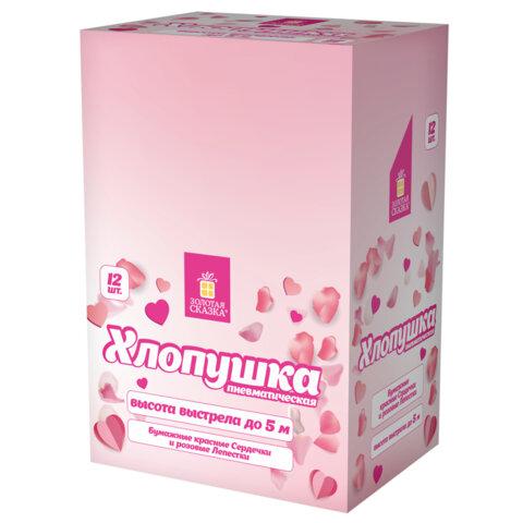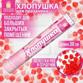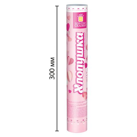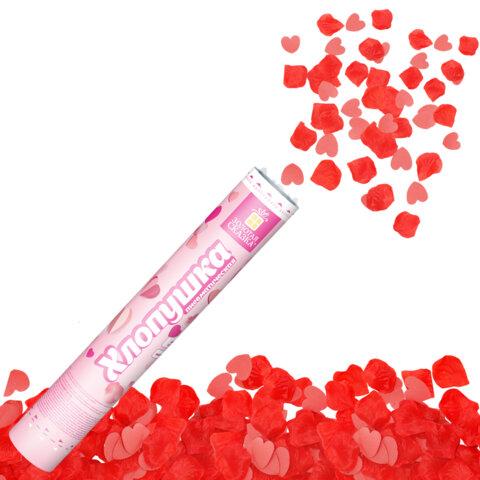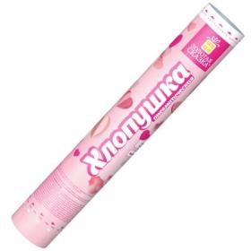 Пневматическая хлопушка не является пиротехникой и работает на основе энергии сжатого воздуха. Конфетти и серпантин ярких цветов можно использовать в помещении или на улице. Хлопушка подойдет для праздников, концертов, реквизита для фотосессии.Хлопушка высотой 30 см с бумажным наполнителем в виде красных сердечек и розовых лепестков является абсолютно безопасной. Выстрел осуществляется под действием сжатого воздуха. Не является пиротехникой. Средняя дальность выстрела – 3-5 м. Корпус хлопушки состоит из двух частей: пневматического баллона со сжатым воздухом и картонного цилиндра с наполнителем. Рекомендуется использовать хлопушку внутри больших помещений или на улице.