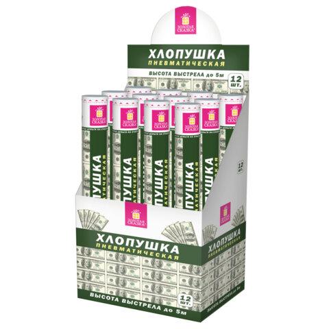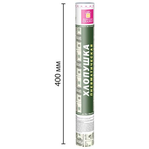 Пневматическая хлопушка не является пиротехникой и работает на основе энергии сжатого воздуха. Конфетти и серпантин ярких цветов можно использовать в помещении или на улице. Хлопушка подойдет для праздников, концертов, реквизита для фотосессии.Хлопушка высотой 40 см с бумажным наполнителем в виде купюр "долларов" является абсолютно безопасной. Выстрел осуществляется под действием сжатого воздуха. Не является пиротехникой. Средняя дальность выстрела – 3-5 м. Корпус хлопушки состоит из двух частей: пневматического баллона со сжатым воздухом и картонного цилиндра с наполнителем. Рекомендуется использовать хлопушку внутри больших помещений или на улице.