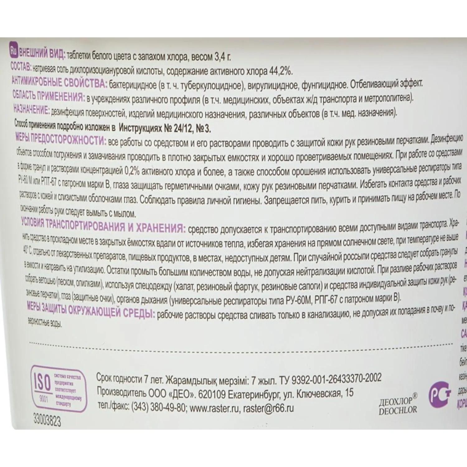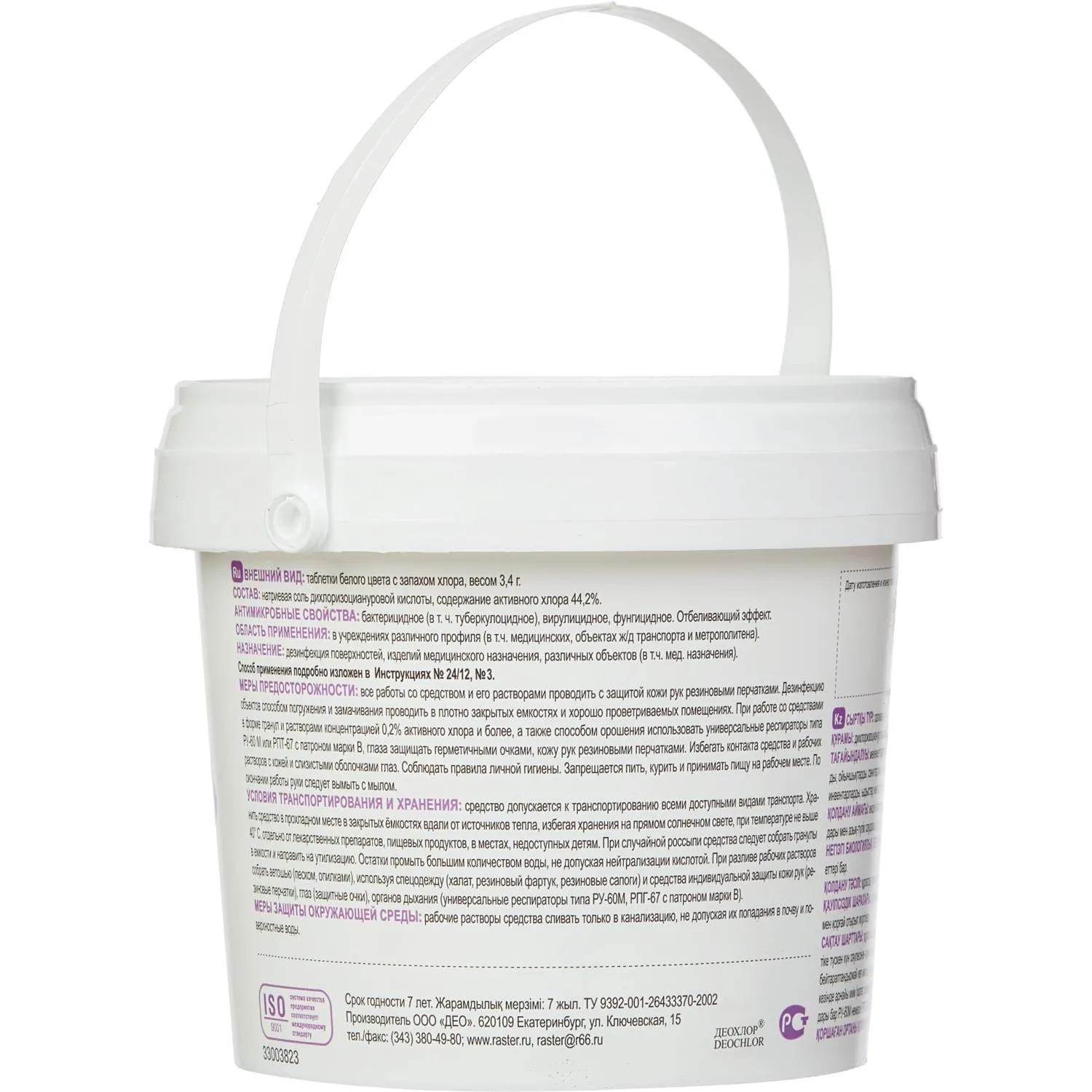 Дезинфицирующее средство Хлорные таблетки Део-хлор 1.02 кг (300 таблеток в упаковке)<br> <br> Дезинфицирующее средство предназначено для быстрой и надёжной обработки поверхностей, оборудования, белья, посуды, инструментов и санитарно-технического инвентаря. Применяется в лечебно-профилактических учреждениях любого профиля, лабораториях, образовательных и детских учреждениях, организациях общественного питания, коммунально-бытовой сфере, на предприятиях водоснабжения и канализации, а также в быту. Средство эффективно уничтожает бактерии, вирусы (в том числе возбудителей полиомиелита, гепатитов, ВИЧ, гриппа), грибы и плесени, обладает отбеливающим эффектом.<br> <br> Для приготовления рабочего раствора одну таблетку растворяют в 10–20 л воды комнатной температуры, в зависимости от требуемой концентрации. Раствор тщательно перемешивают до полного растворения таблеток. Для отбеливания белья и удаления пятен применяют 0.03% раствор, нагретый до +50°C, с выдержкой 30 минут. Раствор не требует смывания с поверхностей, не повреждает обработанные материалы и сохраняет активность в течение 9 суток.<br> <br> Хранить средство следует в плотно закрытой заводской упаковке, в сухом и прохладном месте, защищённом от света и влаги, отдельно от лекарственных средств и продуктов питания, вне доступа детей. Состав: натриевая соль дихлоризоциануровой кислоты (содержание активного хлора 44.5±4.5%).<br> <br> При работе необходимо использовать резиновые перчатки. Не допускать попадания раствора в глаза, на кожу и слизистые оболочки. В случае контакта промыть поражённый участок большим количеством воды. При попадании в глаза — промыть водой несколько минут и закапать 20% раствор сульфацила натрия.<br> <br> Внешний вид и/или характеристики товара могут быть изменены производителем в соответствии с производственным процессом.