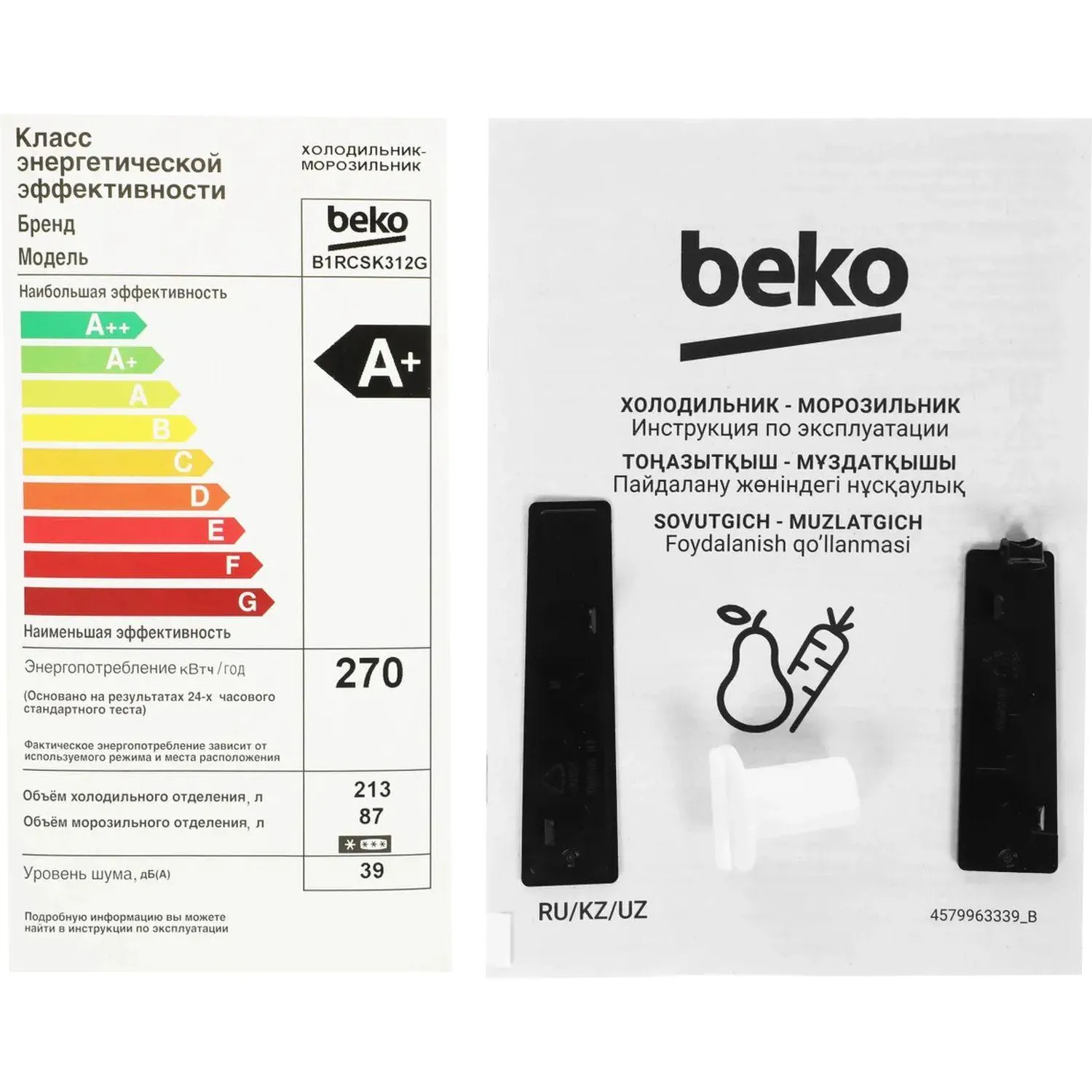 холодильник с морозильной камерой|Класс энергопотребления A+|отдельностоящий/с нижней морозильной камерой|Полезный объём 300 л|Объем холодильной камеры 213 л|Объем морозильной камеры 87 л|Расположение мороз.камеры нижнее|Количество камер 2|Система охлаждения Статическая|Макс. уровень шума 39 дБ|Цвет серый