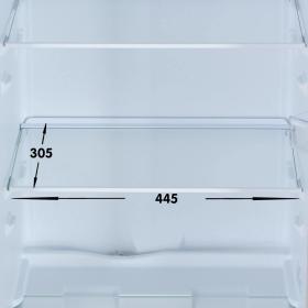 В холодильной камере установлены четыре полки из закаленного стекла. Материал устойчив к нагрузкам и механическим повреждениям, что позволяет ставить тяжелые кастрюли или банки. Возможность регулировки высоты полок помогает адаптировать пространство под посуду любого размера.