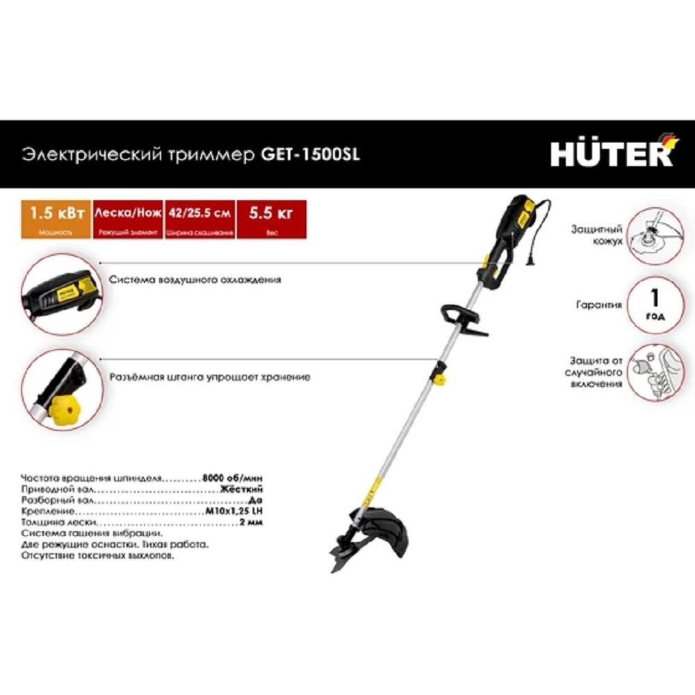 Предлагаем купить триммер GET-1500SL от известного производителя Huter. Данная модель работает от сети 220 В, весит 5.5 кг, ширина скашивания – 42 см, режущий элемент – леска/нож.