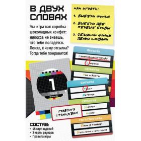 Настольная игра – отличный способ весело и интересно провести время в компании друзей. Подходит для вечеринок и дружеских встреч."В двух словах: Кино" – это быстрая, азартная и весёлая настольная игра, в которой участники проверят свои находчивость и умение быстро соображать. Важно будет не просто знать фильмы, сериалы и мультфильмы, но и уметь передать их суть всего в двух словах!