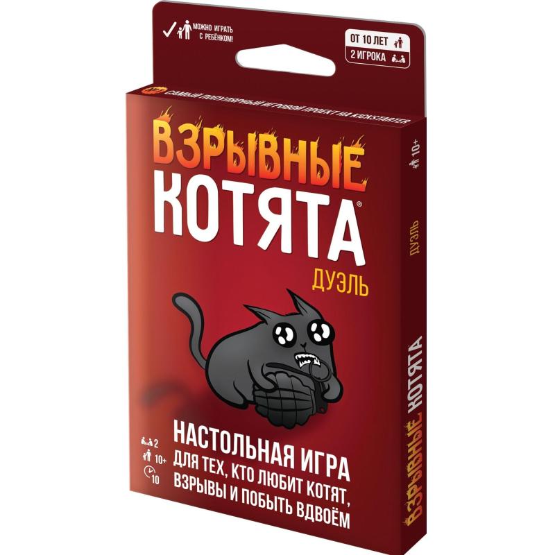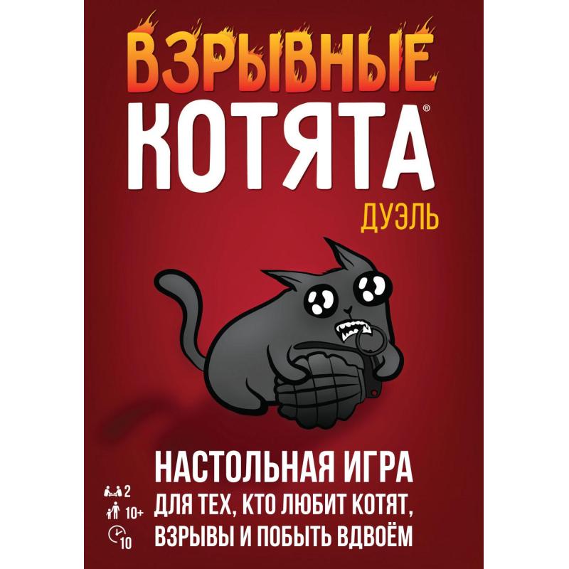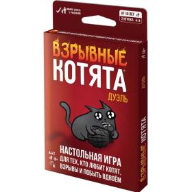 "Взрывные котята: Дуэль" – это новая версия мирового хита, что позволит взглянуть на игру с совершенно новой стороны. Если классические "Взрывные котята" играются тем веселее, чем больше людей, то в "Дуэль", как можно догадаться, могут играть лишь двое.От оригинальной игры "Дуэль" отличается другим составом колоды, адаптированным сугубо под двух игроков, и более компактной коробкой.