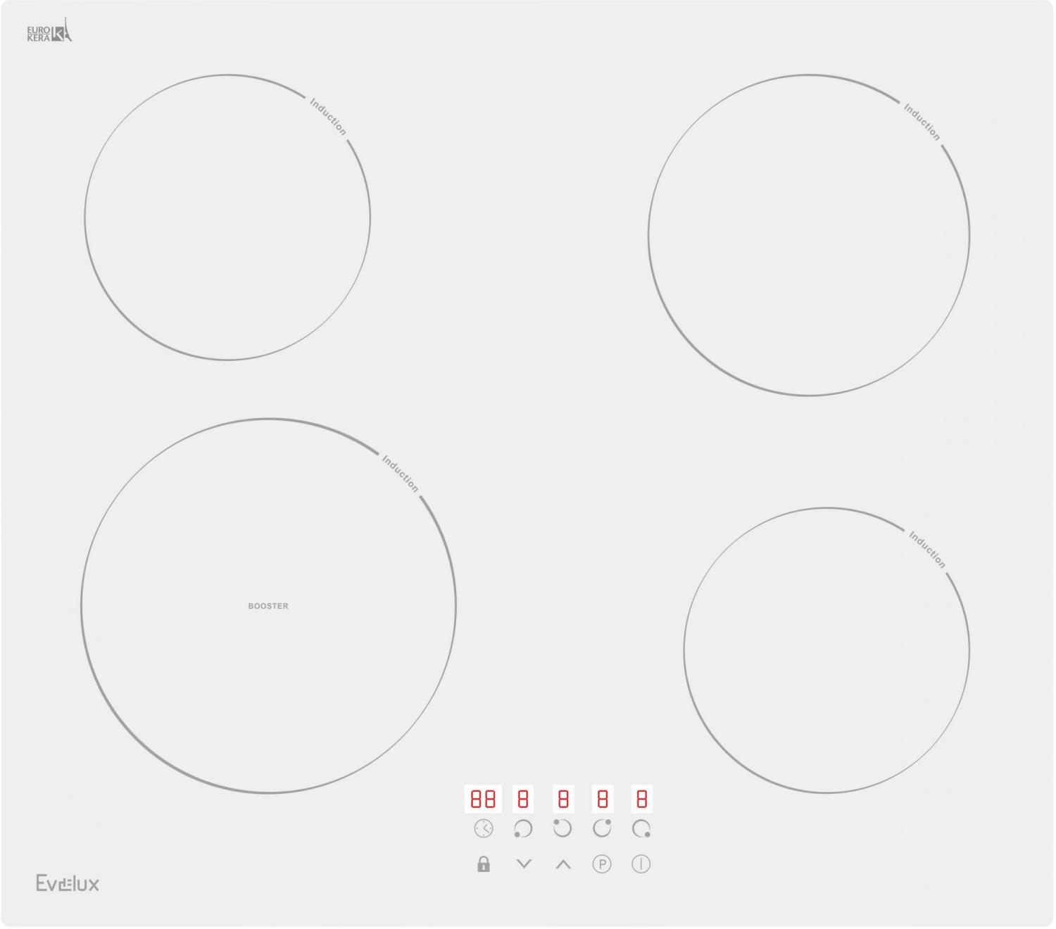 Встраиваемая индукционная панель EVELUX HEI 641 W — это современная электрическая варочная поверхность, использующая передовую индукционную технологию для быстрого и эффективного приготовления пищи. Она сочетает в себе стильный дизайн с белым стеклокерамическим покрытием от французского производителя Eurokera и широкий набор интеллектуальных функций. Эта модель идеально подходит для тех, кто ценит точный контроль, безопасность и высокую производительность на кухне.