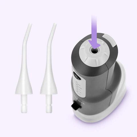 В комплекте к ирригатору идут две классических струйных насадки. Струя воды не только очищает труднодоступные места, но и тщательно массирует дёсны, что является хорошей профилактикой заболевания дёсен.