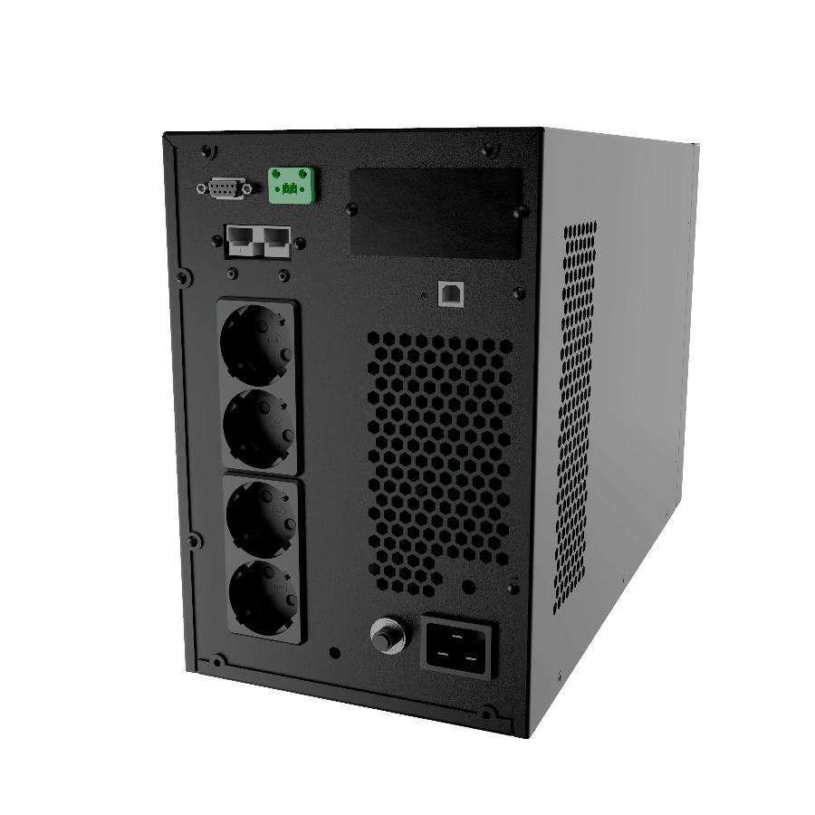 ИБП выполнен в напольном корпусе, оснащен цифровыми сигнальными процессорами (DSP), благодаря чему достигнута высокая эффективность преобразований энергии вплоть до 95,5%. Инновационная технология трехуровнего преобразования позволила создать устройство компактных размеров с повышенной плотностью мощности, способное эффективно защищать чувствительное оборудование от перебоев напряжения.