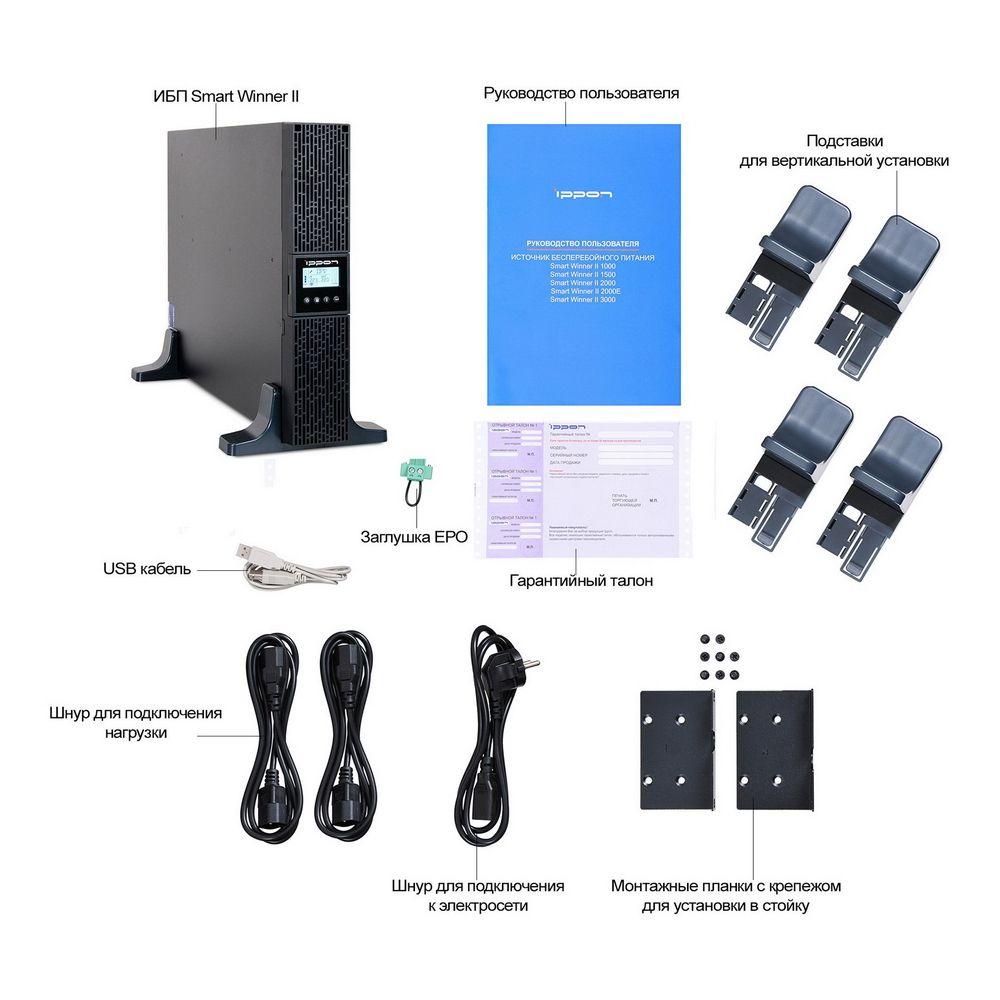 | Комплект поставки | ИБП, документация, кабель питания, 2 кабеля для нагрузки, кабель USB, заглушка EPO, съемные ножки, крепеж для серверного шкафа |