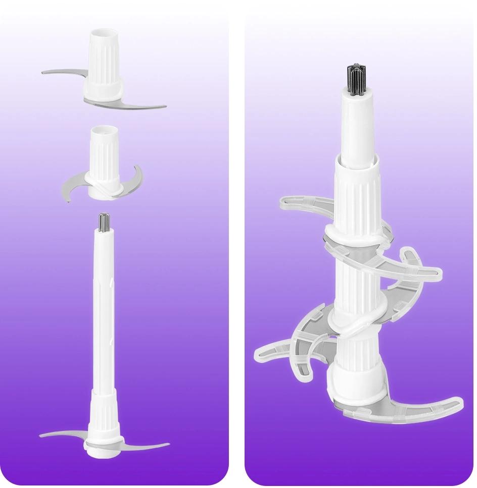 | Комплектация | Измельчитель (моторный блок, крышка чаши с уплотнительным кольцом, насадка для измельчения с двумя съемными блоками ножей и шестью защитными кожухами, чаша с фиксатором насадки на оси чаши и с нескользящей подкладкой), насадка для взбивания, насадка для чеснока, лопатка |