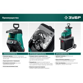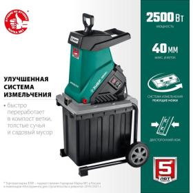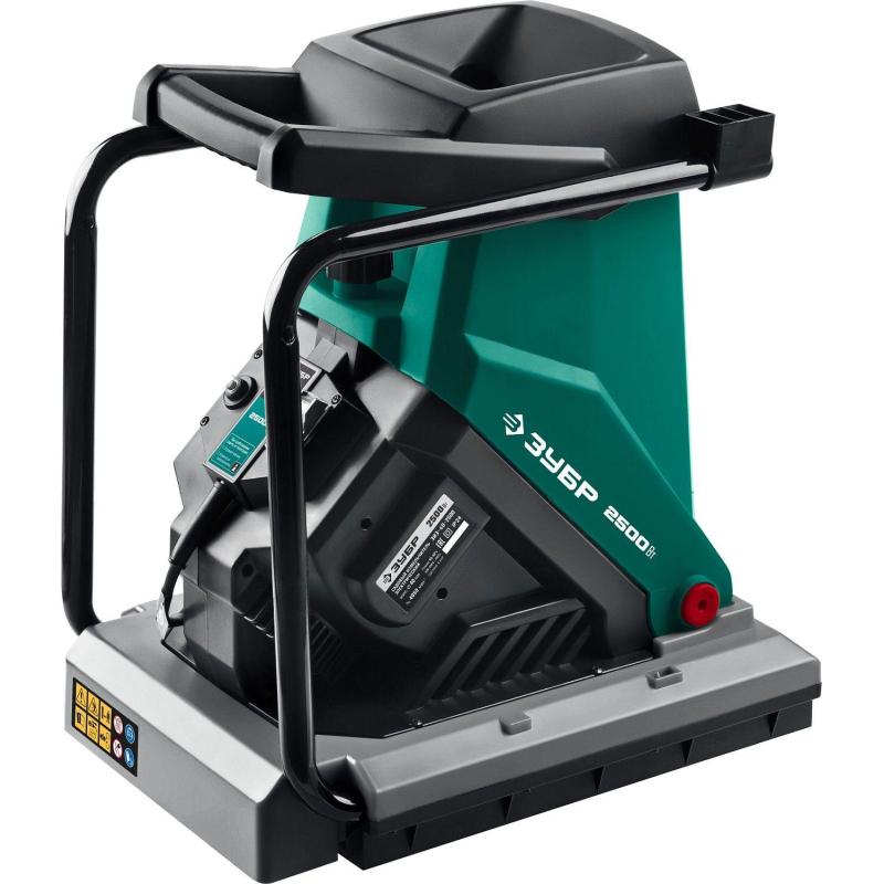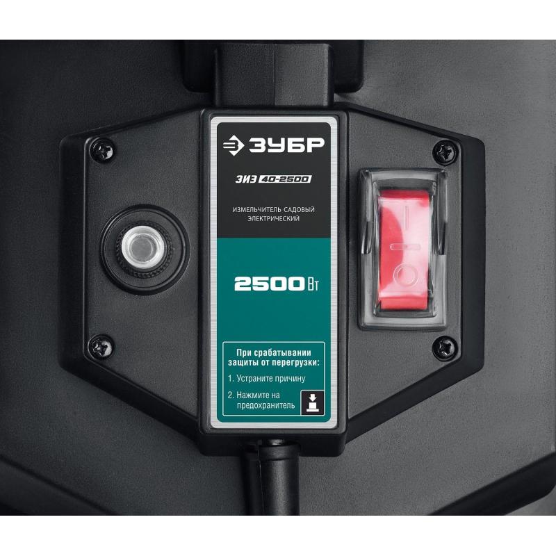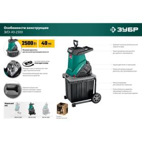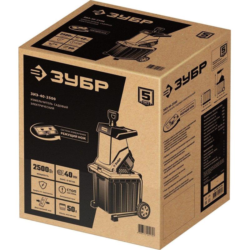 Измельчитель садовый электрический Зубр (ЗИЭ-40-2500)<br><br>Прекрасный помощник для измельчения отходов растительного происхождения. Листья, сучки, остатки корней, скошенная трава теперь не будут бесполезным мусором на участке, а послужат отличным удобрением для грядок.<br><br>Применение<br>Для измельчения отходов растительного происхождения (веток, листьев, скошенной растительности)<br><br>Преимущества<br>• Режущий нож идеально подходит для измельчения свежей растительности<br>• Режущие ножи из закалённой стали с двухсторонней заточкой обеспечивают отличную режущую способность с сохранением режущих свойств и длительное использование благодаря возможности перестановки<br>• Удобный толкатель для безопасной подачи отходов<br>• Ремённый редуктор для исключения повреждений двигателя при заклинивании вала<br>• Пластиковый контейнер большого объёма для удобного сбора продуктов измельчения<br>• Защита двигателя от перегрузки<br>• Блокировка включения при снятом загрузочном устройстве<br>• Рама-трансформер для компактного хранения<br>• Колёса большого диаметра увеличивают мобильность и облегчают эксплуатацию изделия<br><br>Базовая гарантия сроком 3 года, при условии только бытового применения. В случае профессионального использования инструмента базовая гарантия устанавливается 1 год с даты продажи. Расширенная гарантия на 5 лет предоставляется только при условии использования товара в бытовых целях, прохождения периодического обслуживания в авторизованном сервисном центре, при регистрации инструмента на сайте производителя в течение 4-х недель с момента покупки.<br><br>Внешний вид и/или характеристики товара могут быть изменены производителем в соответствии с производственным процессом.