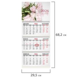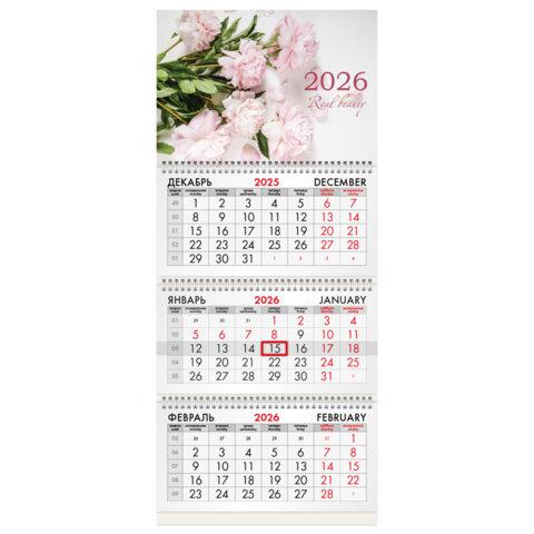 Квартальный календарь BRAUBERG "Пионы" предназначен для делового планирования.Офисный календарь на 2026 год на 3-х гребнях. Для удобства планирования состоит из 3-х блоков с календарными сетками на три месяца - предыдущего, текущего и последующего. Блок календаря напечатан на офсетной бумаге плотностью 65 г/м2. Подложка изготовлена из мелованного картона плотностью 235 г/м2. Курсор-бегунок выделяет текущую дату. Вертикальное расположение.