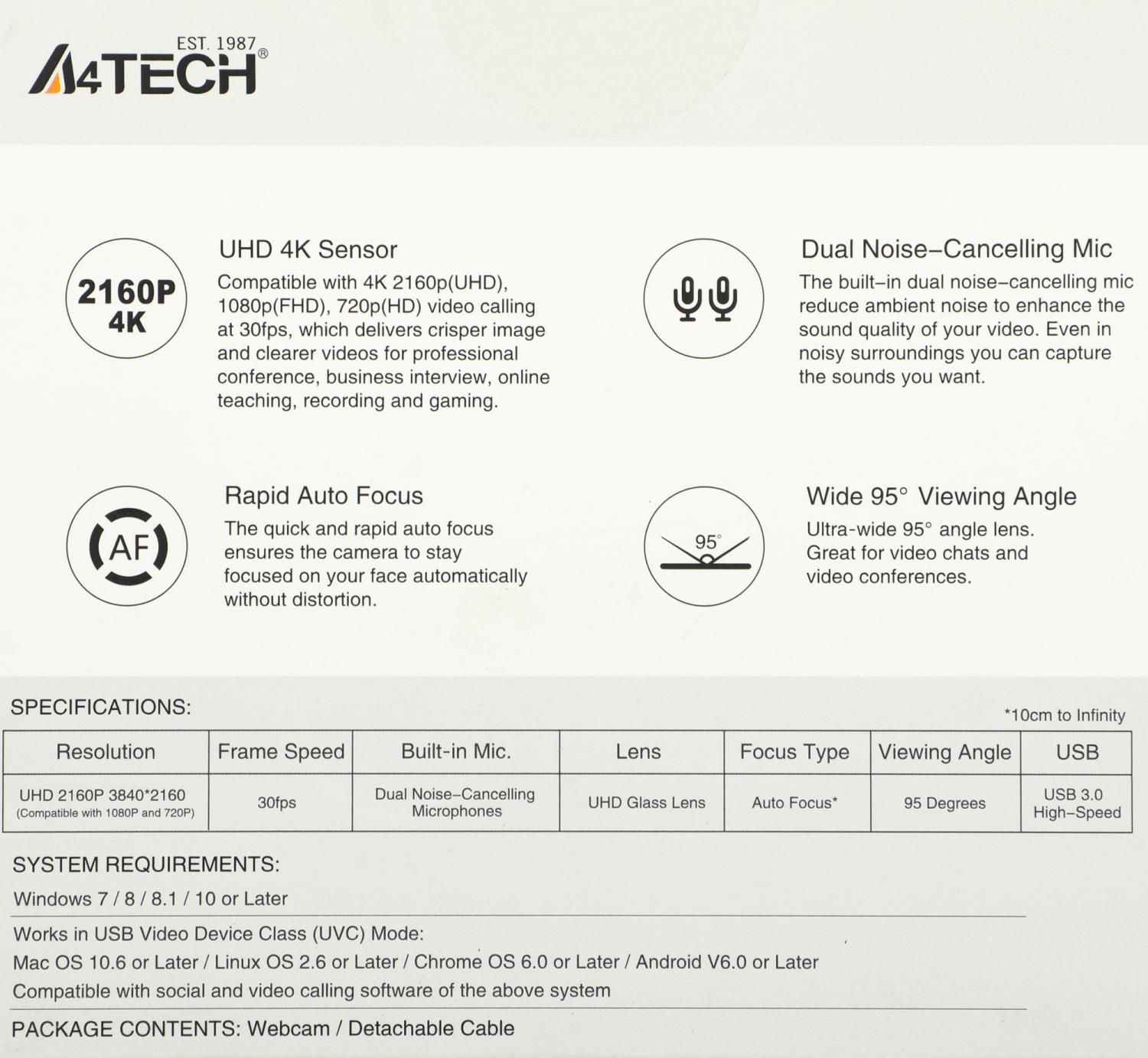 Камера Web A4Tech PK-1000HA черный 8Mpix (3840x2160) USB2.0 с микрофоном / 4dealer.ru