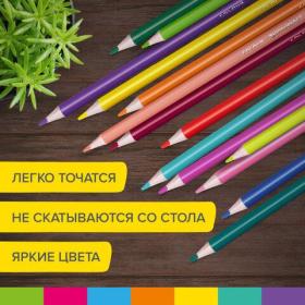 Ребёнок будет рисовать легко и с удовольствием благодаря эргономичной трехгранной форме корпуса карандашей. Корпус карандаша изготовлен из переработанного eco-friendly пластика, который гарантирует легкую и плавную заточку. Яркий лакированный корпус карандашей выполнен в цвет грифеля. Грифель диаметром 3 мм обладает повышенной прочностью, насыщенностью цвета и мягкостью письма. Карандаши заточены и упакованы в качественную картонную коробку с европодвесом.