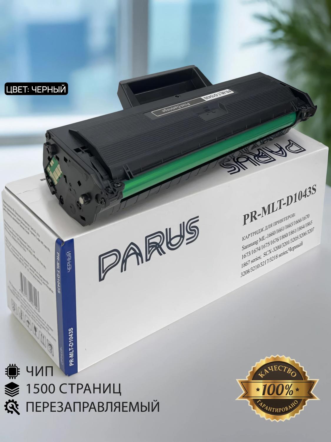 Картридж Parus PR-MLT-D1043S - может использоваться владельцами лазерных монохромных принтеров Samsung: ML1660-ML1866 SCX3200-SCX3217. Этот картридж обеспечивает стабильное качество печати и долгий срок службы позволяя вам печатать до 1 500 страниц. Картридж Парус PR MLT-D1043S совместим с принтерами и многофункциональными устройствами Samsung: ML-1660 ML-1661K ML-1665 ML-1665K ML-1666 ML-1670 ML-1674 ML-1675 ML-1676 ML-1676P ML-1678 ML-1860 ML-1861K ML-1864 ML-1864K ML-1865 ML-1865K ML-1865WK ML-1866W; МФУ: SCX-3200 SCX-3201 SCX-3201G SCX-3205 SCX-3205W; SCX-3206 SCX-3206W SCX-3210 SCX-3217; Особенности картриджа Parus PR MLT - D1043S для Самсунг: Черный цвет; Высокое качество черной краски для печати: многоразовый катридж MLT-D104S гарантирует четкие и яркие отпечатки благодаря качественным материалам; Долговечность: С ресурсом в 1500 страниц (при стандартном заполнении в 5%) этот картридж подходит для интенсивного использования в офисе или дома; Возможность замены тонера (черная краска для печати) в картридже Samsung MLTD1043S. Есть боковая заглушка для замены тонера под крышкой. Необходимо замена чипа или перепрошивка принтера. Внимание: перед заменой тонера - рекомендуется почистить внутренности картриджа от старого тонера; Легкость замены перезаправляемого картриджа MLT D1043 S; Изготовлен по стандарту ISO/IEC 19752 (оценка ресурса картриджа MLTD 1043S) ISO 9001 (стандарт управления качества предприятия) ISO 14001 (стандарт экология предприятия); Отвечает требованиям нормативно-технической документации ГОСТ-Р и имеют все необходимые подтверждающие сертификаты соответствия; Стандарт ISO/IEC 19752: ISO/IEC19752 подтверждает ресурс картриджа МЛТ Д1043S не менее 1 500 стандартных заполненных страниц на 5% страницы формата A4; Стандарт описывает строгую методику тестирования картриджей на трех различных принтерах что позволяет минимизировать ошибки связанные с различиями в характеристиках самих принтеров. Это обеспечивает более точные и воспроизводимые результаты; Стандарт ISO/IEC-19752 учитывает такие факторы как плотность заливки и эффективность переноса тонера на бумагу; Стандарт ISO 14001: Данный сертификат выдается компаниям которые стремятся улучшить свои экологические практики и продемонстрировать свою ответственность перед обществом и окружающей средой; Стандарт ISO 9001: Данный сертификат означает что компания постоянно улучшает свои процессы повышает удовлетворенность своих клиентов и демонстрирует приверженность качеству;