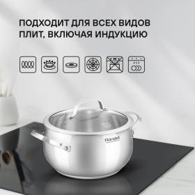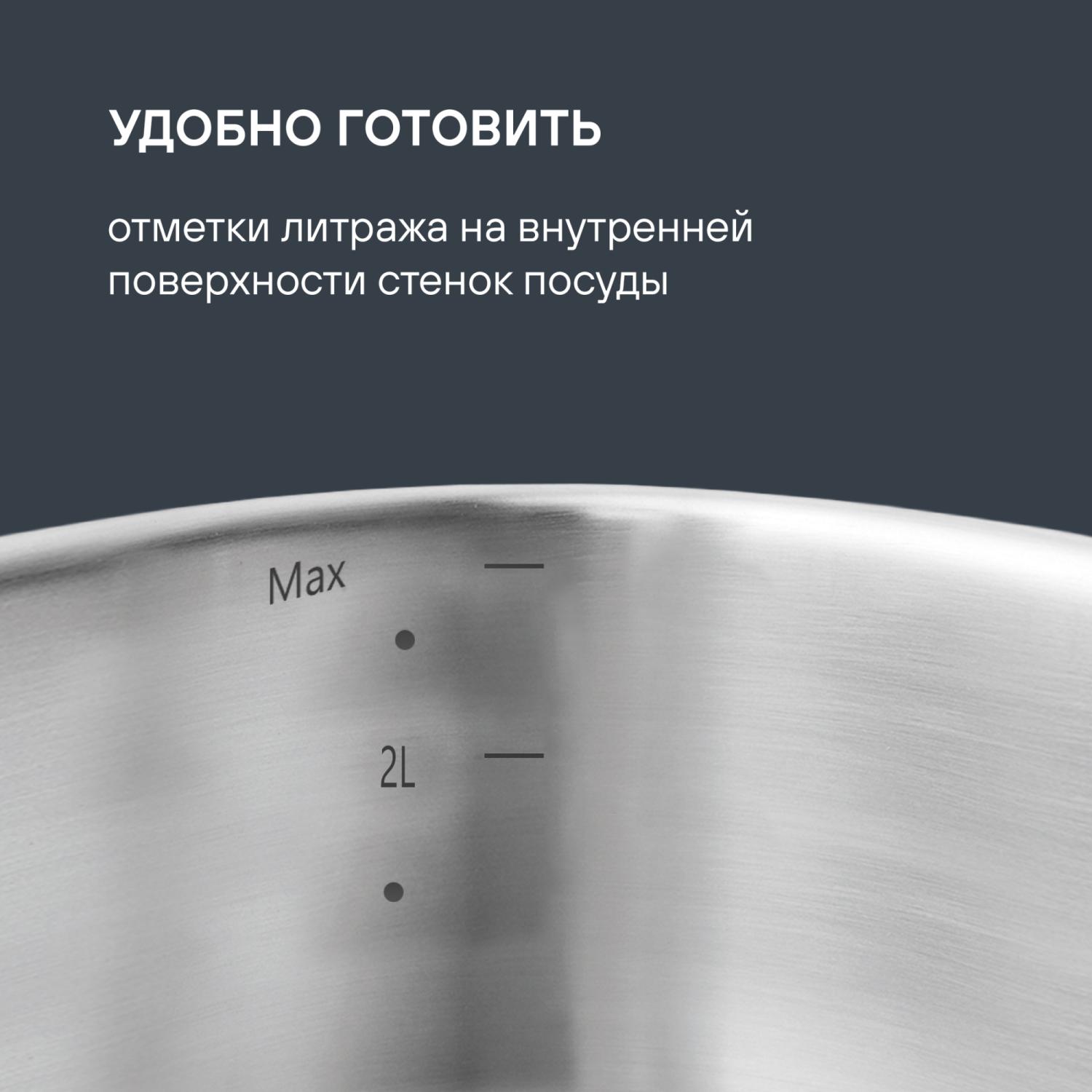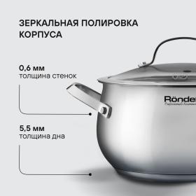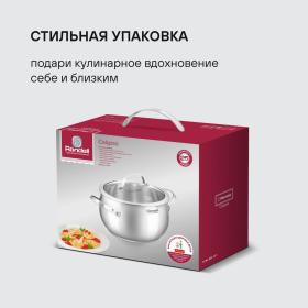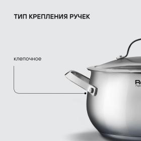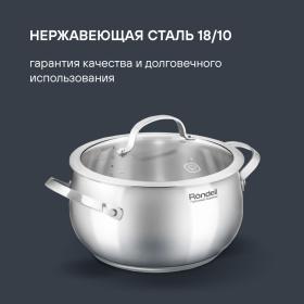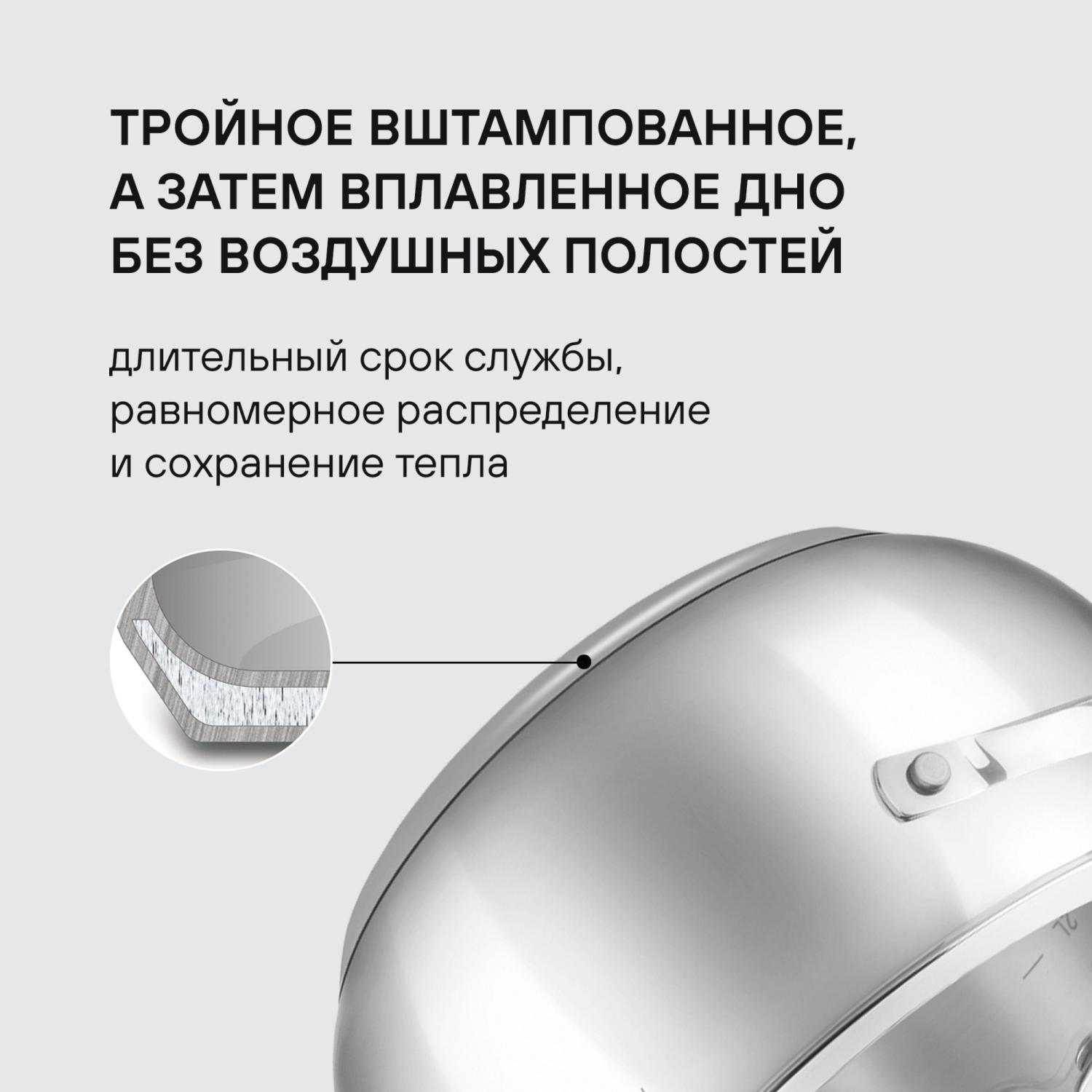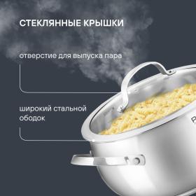 | Особенности | Материал: высококачественная нержавеющая сталь 18/10. Технология: тройное вштампованное, а затем вплавленное дно без воздушных полостей. Материал крышки: термостойкое стекло. Аксессуары: изящные, из нержавеющей стали. Преимущества: округлая форма корпуса. |