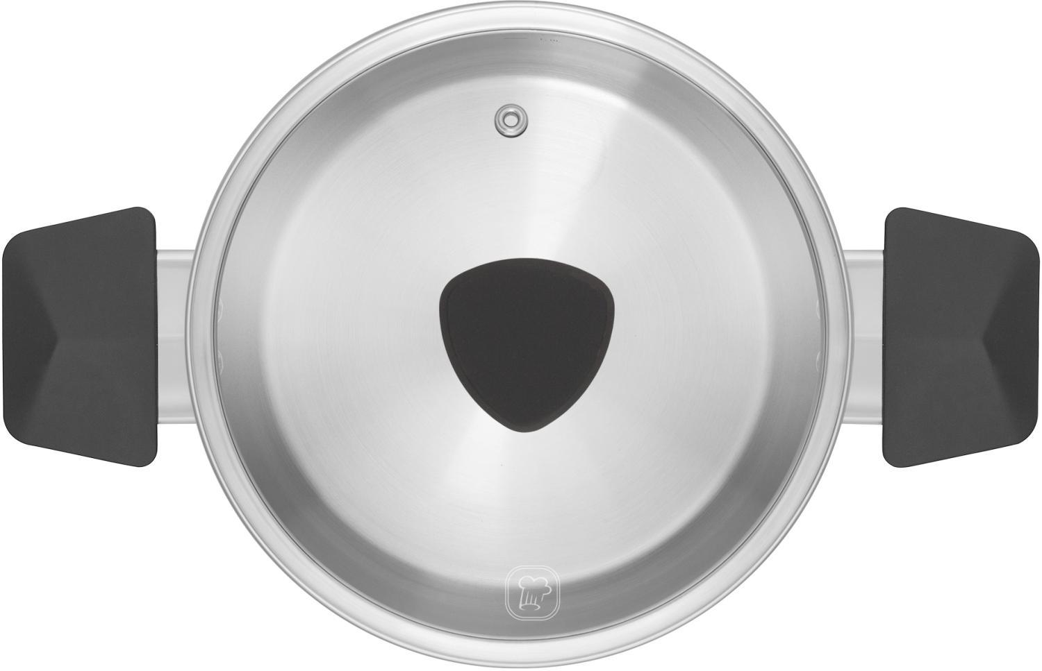 | Особенности | Материал: высококачественная нержавеющая сталь 18/10. Технология: тройное вштампованное, а затем вплавленное дно без воздушных полостей. Материал крышки: термостойкое стекло. Преимущества: эргономичная ручка из бакелита с внешним покрытием Soft Touch. |