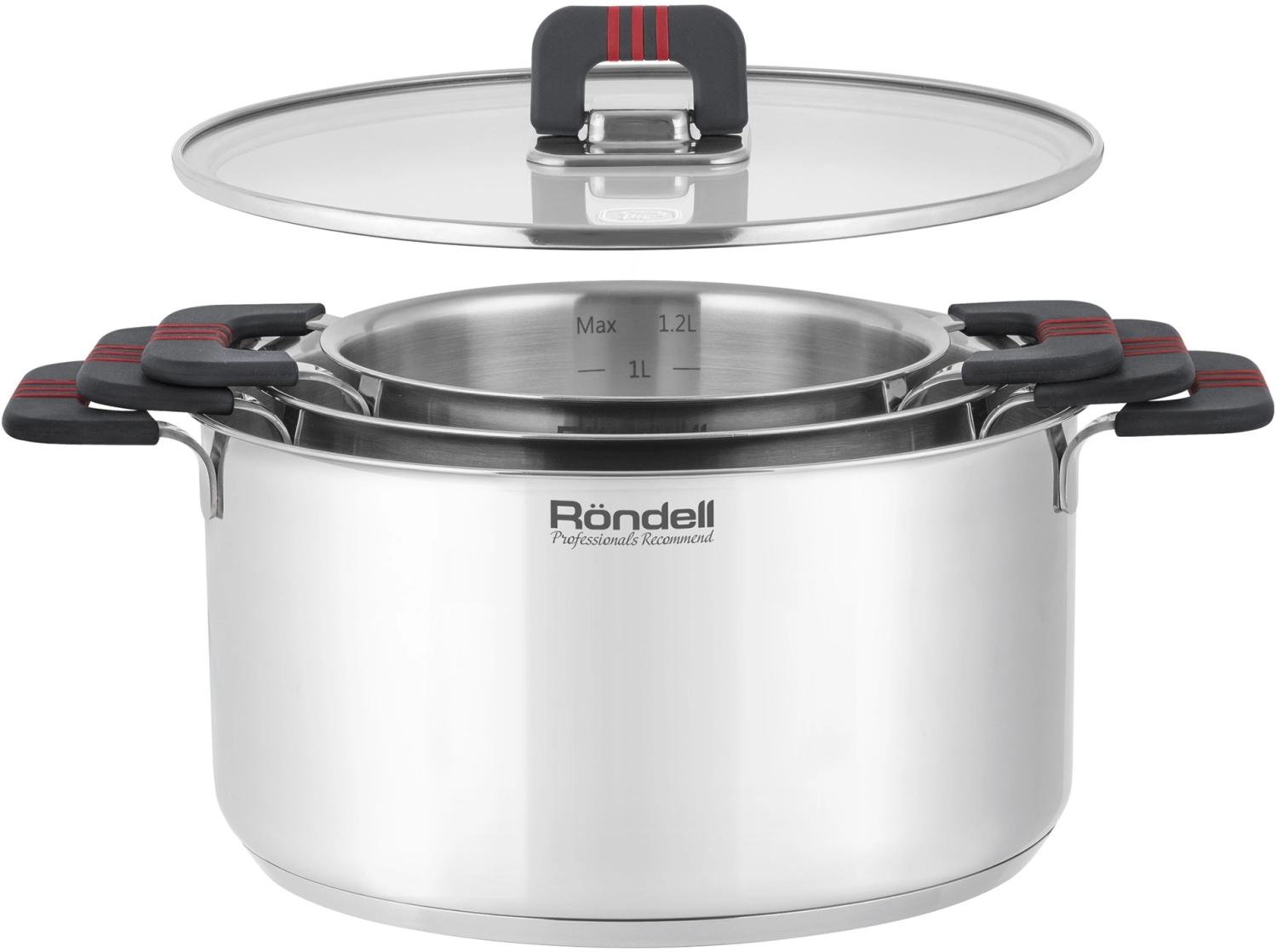 | Особенности | Технология: тройное вштампованное, а затем вплавленное дно без воздушных полостей. Складная ручка на плоской крышке для экономии пространства при хранении; Силиконовые вставки на ручках против скольжения; Отверстие для выпуска пара; Компактное хранение: кастрюли легко складываются одна в одну. |