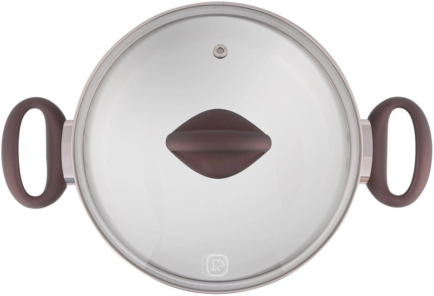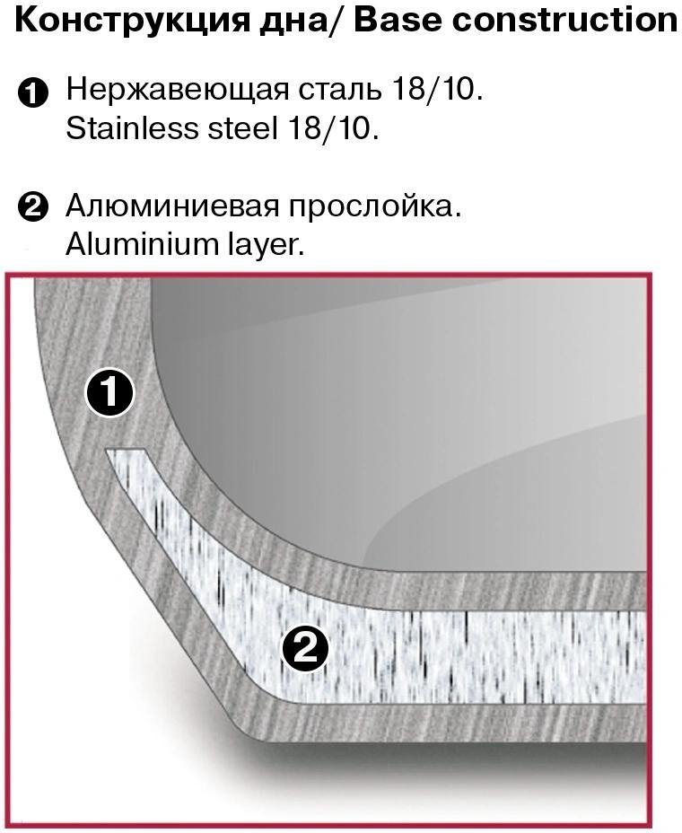 | Особенности | Материал: высококачественная нержавеющая сталь 18/10. Технология: тройное вштампованное, а затем вплавленное дно без воздушных полостей. Материал крышки: термостойкое стекло. Преимущества: эргономичная ручка с внешним покрытием Soft Touch. |