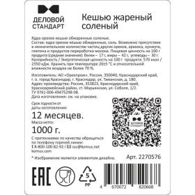 Кешью Деловой Стандарт жареный солёный 1 кг<br /> <br /> Кешью Деловой Стандарт — обжаренный до золотистого цвета и слегка подсоленный для насыщенного пикантного вкуса.<br /> Он отлично подходит как самостоятельная закуска, а также может использоваться в салатах, кондитерских изделиях, десертах и других блюдах. <br /> <br /> Состав: ядра орехов кешью обжаренные, соль.<br /> Возможно присутствие в незначительном количестве частиц других орехов, арахиса, кунжута, глютена и продуктов переработки молока.<br /> Пищевая ценность на 100 г продукта (средние значения): белки — 17 г, жиры — 42 г, углеводы — 30 г.<br /> Калорийность / Энергетическая ценность на 100 г продукта: 570 ккал / 2350 кДж.<br /> <br /> Срок годности: 12 месяцев.<br /> Хранить при температуре от +5 °С до +25 °С и относительной влажности воздуха не более 70 %.<br /> Вес: 1000 г.<br /> Страна производства: Россия.<br /> <br /> Внешний вид и/или характеристики товара могут быть изменены производителем в соответствии с производственным процессом.<br />