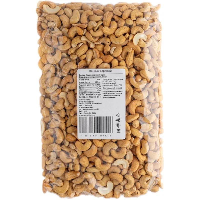 Кешью жареный очищенный 1 кг. Продукт готов к употреблению. Кешью (он же индийский орех) очищенный, жаренный. Наряду с белками, жирами и углеводами содержит никотиновую и жирные кислоты, витамины групп E, B и A, клетчатку, железо, калий, цинк, фосфор, марганец, селен, антиоксиданты (фенольные соединения и фитостеролы). Такой набор компонентов делает орехи кешью чрезвычайно полезными. Их можно использовать для перекусов, класть в салаты и десерты.<br /> <br /> Допускается наличие в упаковке орехов со сколами (5-10% от всей массы), возникающими в результате переработки при чистке, сушки в промышленных барабанах, при фасовке и транспортировке и никак не влияющими на качество и вкус.<br /> Пищевая ценность на 100 г продукта: белки — 26 г, жиры — 55.5 г, углеводы — 15 г. <br /> Энергетическая ценность на 100 г продукта: 653.7 ккал.<br /> Срок годности: 12 месяцев.<br /> Хранить при температуре не выше 20 С при относительной влажности не более 70%.<br /> Вес: 1 кг.<br /> Страна производства: Россия.<br /> <br /> Внешний вид и/или характеристики товара могут быть изменены производителем в соответствии с производственным процессом.