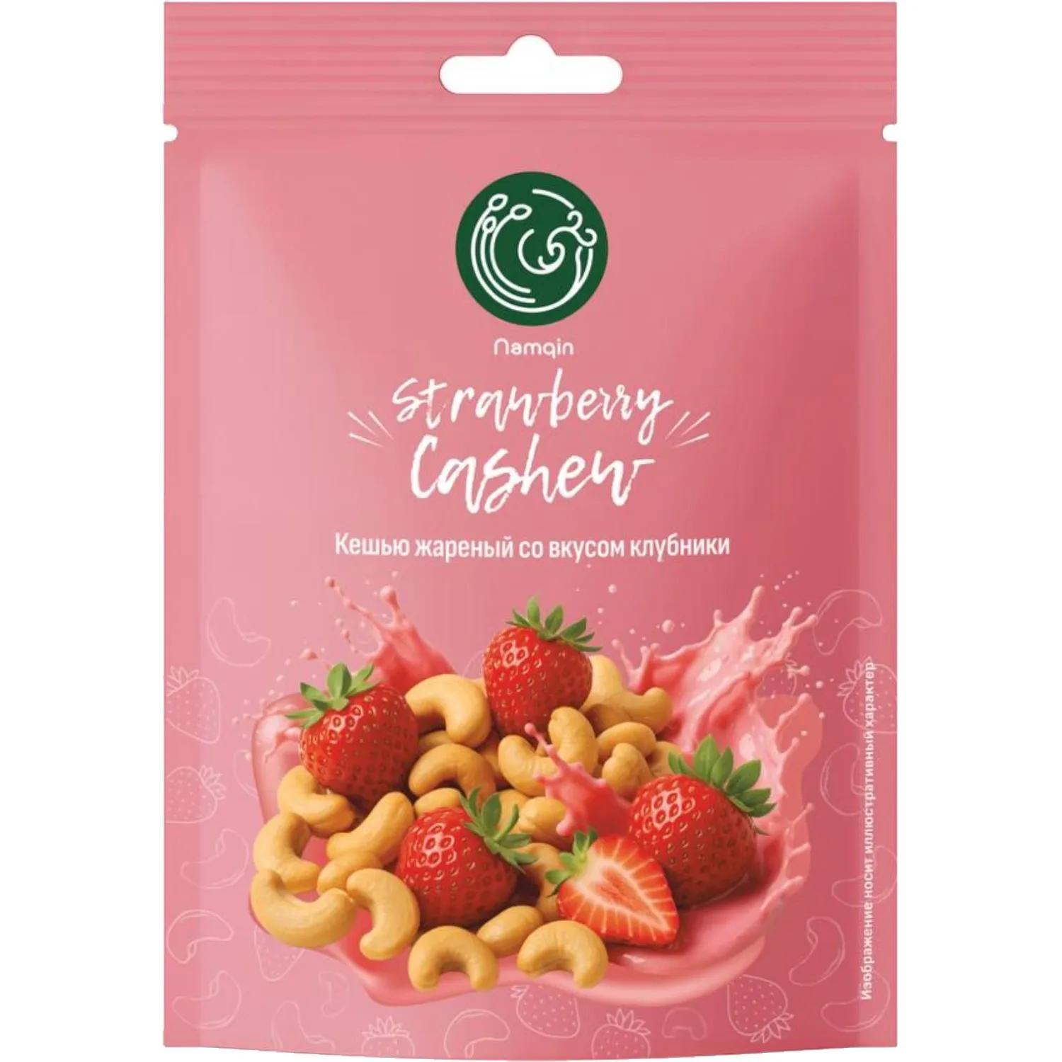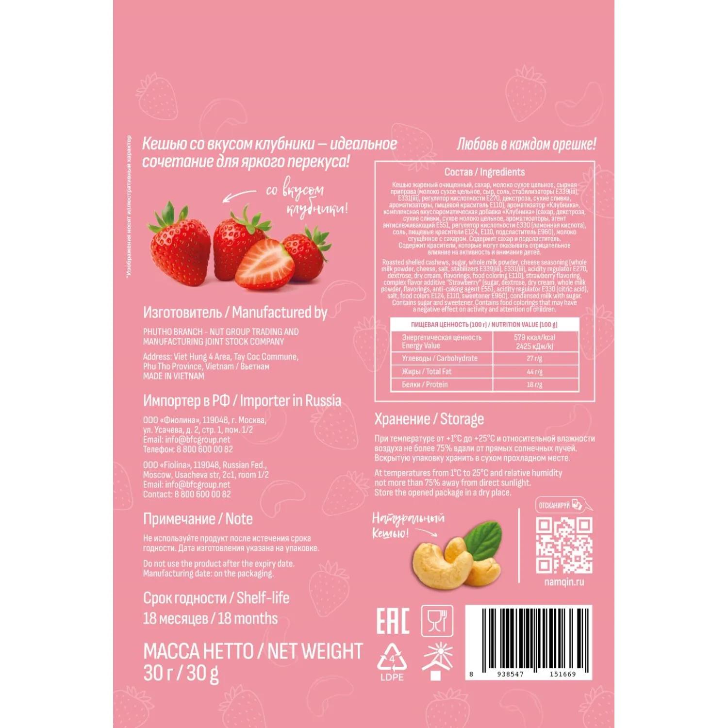 Кешью жареный Namqin со вкусом клубники.<br>Состав: кешью жареный очищенный, сахар, молоко сухое цельное, сырная приправа (молоко сухое цельное, сыр, соль, стабилизаторы Е339(iii), Е331(iii), регулятор кислотности Е270, декстроза, сухие сливки, ароматизаторы, пищевой краситель Е110), ароматизатор «Клубника», комплексная вкусоароматическая добавка «Клубника» (сахар, декстроза, сухие сливки, сухое молоко цельное, ароматизаторы, агент антислеживающий Е551, регулятор кислотности Е330 (лимонная кислота), соль, пищевые красители Е124, Е110, подсластитель Е960), молоко сгущённое с сахаром. Содержит сахар и подсластитель. Содержит красители, которые могут оказывать отрицательное влияние на активность и внимание детей. <br>Энергетическая ценность: 579 ккал.<br>Пищевая ценность: белки 18 г, жиры 44 г, углеводы 27 г.<br>Условия хранения: хранить при температуре от +1°С до +25°С и относительной влажности воздуха не более 75% вдали от прямых солнечных лучей.<br>Вскрытую упаковку хранить в сухом прохладном месте.<br><br>Внешний вид и/или характеристики товара могут быть изменены производителем в соответствии с производственным процессом.