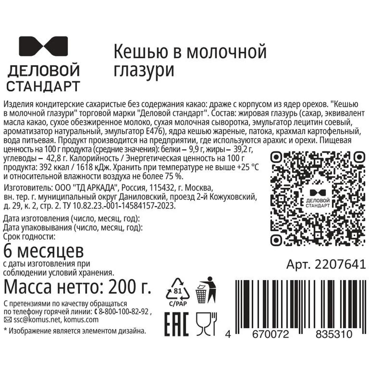 Кешью Деловой Стандарт в молочной глазури жареный 200 г<br><br>Откройте для себя вкус настоящей нежности с нашим жареным кешью в молочной глазури! Хрустящие орешки, окутанные сладкой сливочной нежностью, подарят вам мгновения радости и уютное наслаждение. Удобная упаковка дой-пак 200 г сохраняет свежесть и аромат, чтобы вы могли взять любимый перекус с собой куда угодно.<br><br>Состав: жировая глазурь (сахар, эквивалент масла какао, сухое обезжиренное молоко, сухая молочная сыворотка, эмульгатор лецитин соевый, ароматизатор натуральный, эмульгатор Е476), ядра кешью жареные, патока, крахмал картофельный, вода питьевая.<br><br>Продукт производится на предприятии, где используются арахис и орехи.<br><br>Пищевая ценность на 100 г продукта (средние значения): белки — 9.9 г, жиры — 39.2 г, углеводы — 42.8 г.<br><br>Калорийность / Энергетическая ценность на 100 г продукта: 392 ккал / 1618 кДж.<br><br>Хранить при температуре не выше +25°C и относительной влажности воздуха не более 75%<br><br>ТУ 10.82.23.-001-14584157-2023.<br><br>Срок годности: 6 месяцев с даты изготовления.<br><br>Масса нетто: 200 г.<br><br>Внешний вид и/или характеристики товара могут быть изменены производителем в соответствии с производственным процессом.