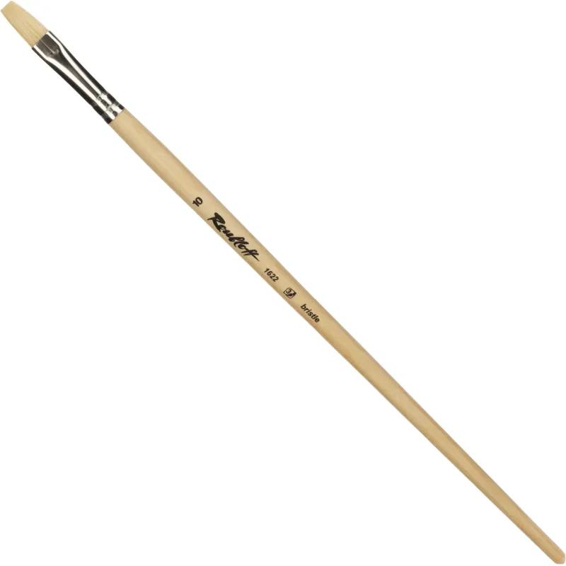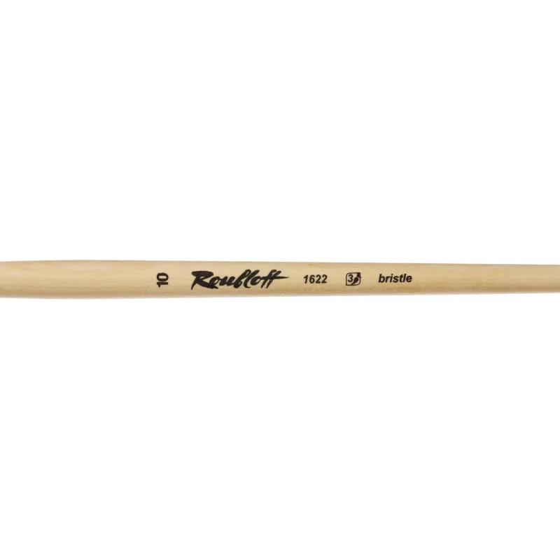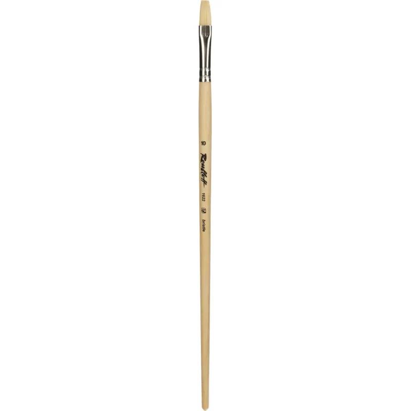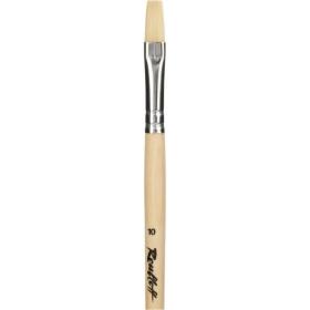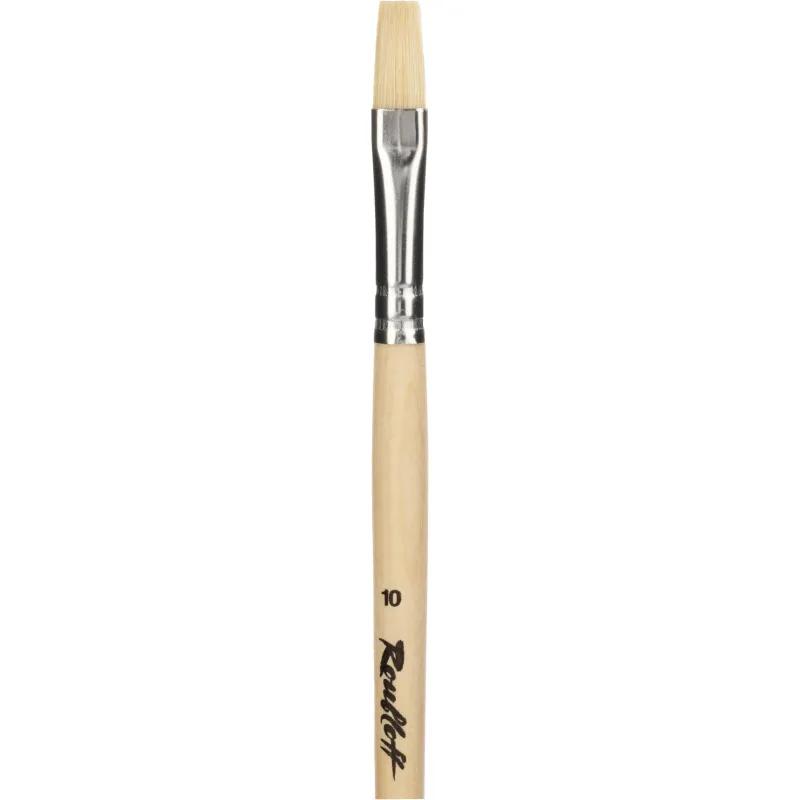 Кисть художественная Roubloff плоская щетина №10<br><br>Плоская кисть «Roubloff» из щетины с длинной ручкой, пропитанной лаком является наиболее оптимальным инструментом для живописной работы с густыми красками в пастозной технике. <br>Алюминиевая обойма надежно собирает очень жесткие, но упругие волоски, которые хорошо наполняются пигментом и отлично отдают краску на поверхность холста. <br>Кисть с такой формой предназначена для работы на крупных участках полотна, так как позволяет наносить широкие и ровные мазки, а также удобна при изображении архитектурных построек и транспортных средств, идеальна для индивидуального изготовления краски требуемого оттенка.
