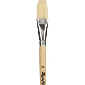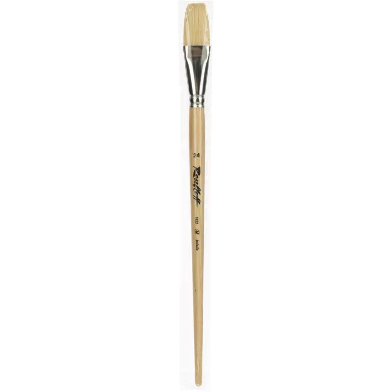Кисть художественная Roubloff плоская щетина №24<br><br>Плоская кисть «Roubloff» из щетины с длинной ручкой, пропитанной лаком является наиболее оптимальным инструментом для живописной работы с густыми красками в пастозной технике. <br>Алюминиевая обойма надежно собирает очень жесткие, но упругие волоски, которые хорошо наполняются пигментом и отлично отдают краску на поверхность холста.<br>Кисть с такой формой предназначена для работы на крупных участках полотна, так как позволяет наносить широкие и ровные мазки, а также удобна при изображении архитектурных построек и транспортных средств, идеальна для индивидуального изготовления краски требуемого оттенка.