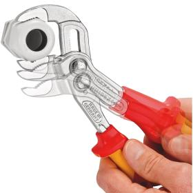 Клещи переставные VDE <nobr>L-250</nobr> мм COBRA KNIPEX <nobr>KN-8726250</nobr><BR>Точная регулировка для оптимальной подгонки под различные размеры деталей и удобное положение рукоятки. Хороший доступ к детали благодаря тонкой конструкции в области головки и шарнира. Самофиксируются на трубах и гайках: нет скольжения по детали, работа без утомления. Захватные губки со специально закаленными зубцами, твердость зубцов примерно 61 HRC: надежный захват при высокой износостойкости. Коробчатый шарнир: высокая стабильность благодаря двум направляющим. Специальный механизм предотвращает случайное защемление пальцев. Хромованадиевая электросталь, кованая, закаленная в масле.<BR><BR><!--noindex-->Внешний вид и/или характеристики товара могут быть изменены производителем в соответствии с производственным процессом.<!--/noindex-->