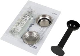 Прибор работает с молотым кофе, для его отмеривания прилагается ложка с темпером. Он поможет плотно спрессовать таблетку. Управление механическое: установка режима (одинарный, двойной эспрессо или пар) производится при помощи кнопок, удобно расположенных на верхней панели. Есть возможность выбрать температуру напитка (три варианта), задать жесткость воды, а также время, через которое прибор автоматически выключится: 9 минут, 30 минут или 3 часа.