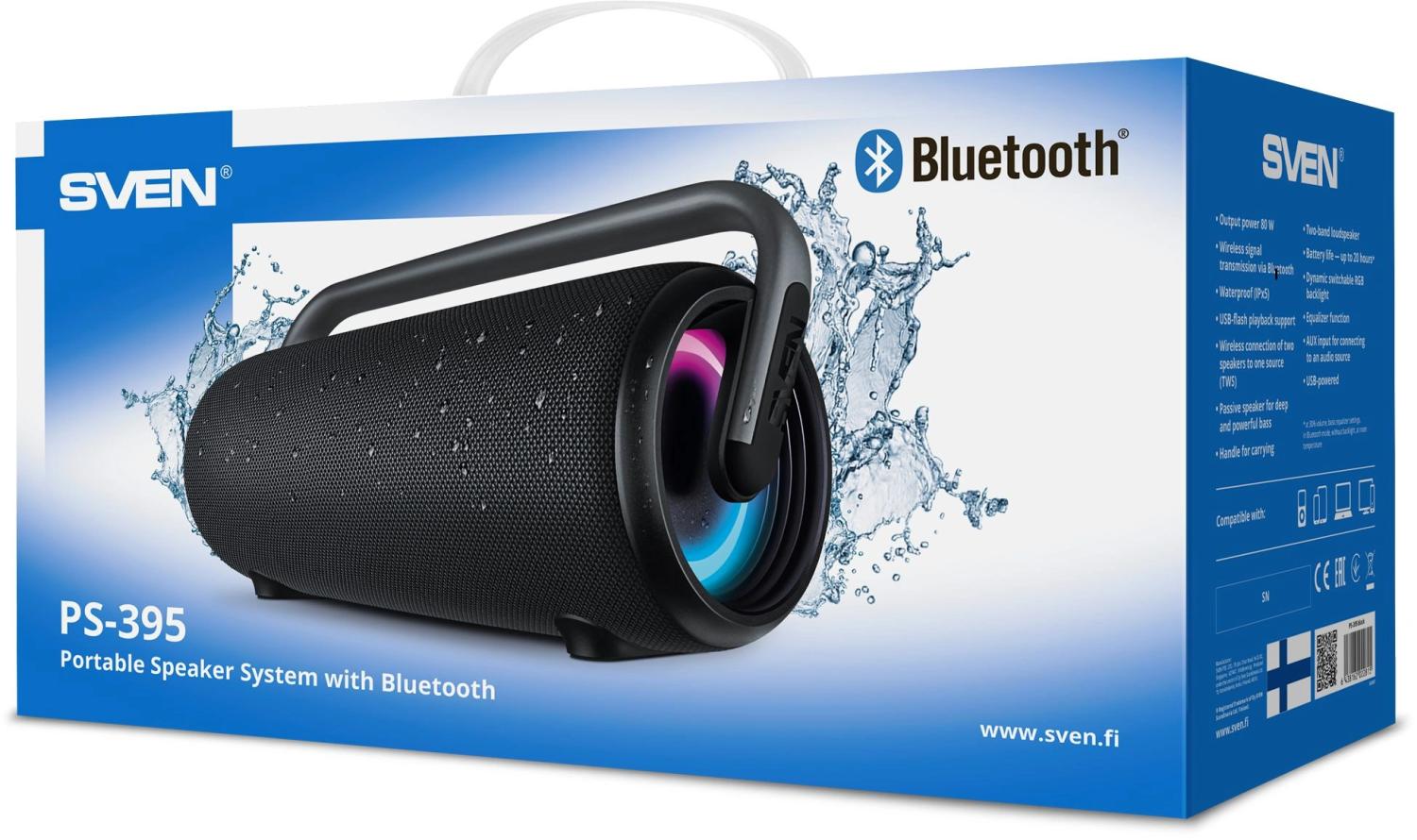 | Текстовое описание | Колонка SVEN АС PS-395, черный (80 Вт, Waterproof (IPx5), TWS, Bluetooth, USB, 4800мА*ч) |