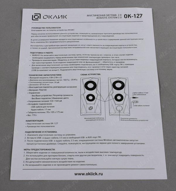 | Комплект поставки | Компьютерная акустика Oklick OK-127 |