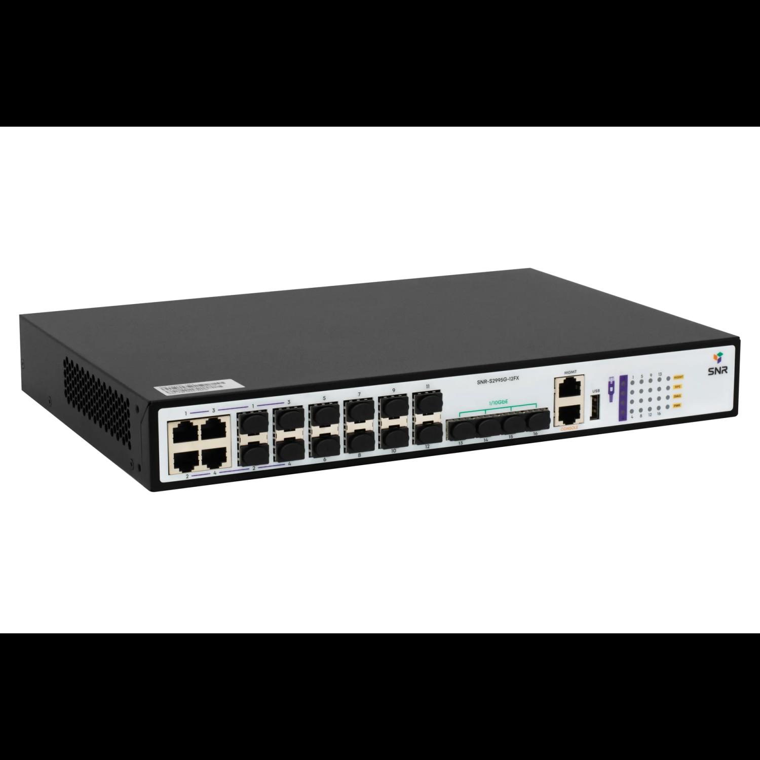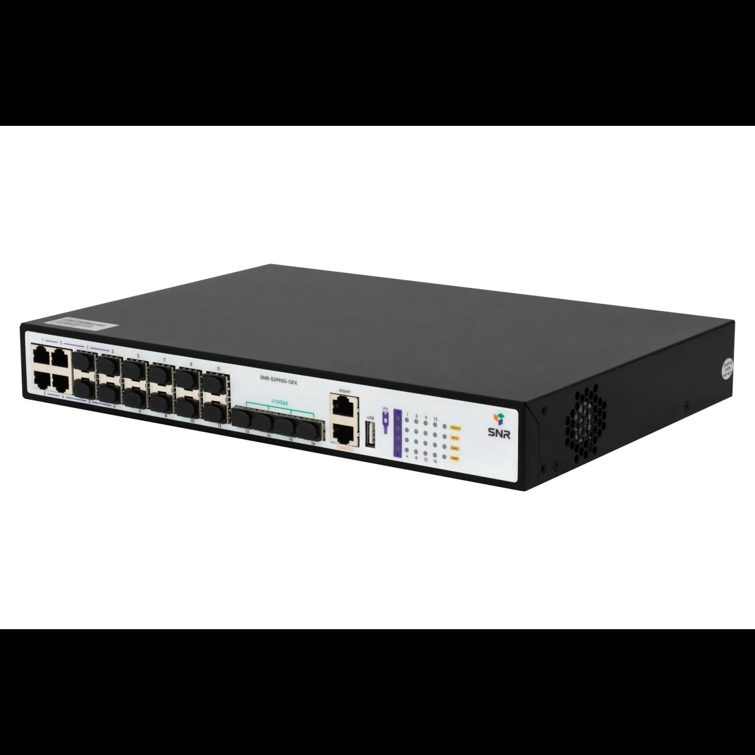 Управляемый гигабитный L3-коммутатор SNR-S2995G-12FX предназначен для использования на уровне агрегации в сетях операторов связи и корпоративных клиентов. Коммутатор выполнен в компактном корпусе, оснащен 8 портами 100/1000Base-X, 4 портами Combo 10/100/1000Base-T|100/1000Base-X SFP и 4 портами 1/10G SFP+. Реализована поддержка динамической маршрутизации (RIPv1/v2, OSPFv2/v3, BGPv4+) до 1024 IPv4 и 256 IPv6 маршрутов, 4096 multicast групп, 16K MAC, 1024 SVI интерфейсов. Коммутаторы можно объединить в стек по технологии VSF High Availability (HA). Данная технология позволяет в случае аварии оперативно перехватить управление стеком без перезагрузки. Стекирование возможно организовать только между одинаковыми моделями одной серии.