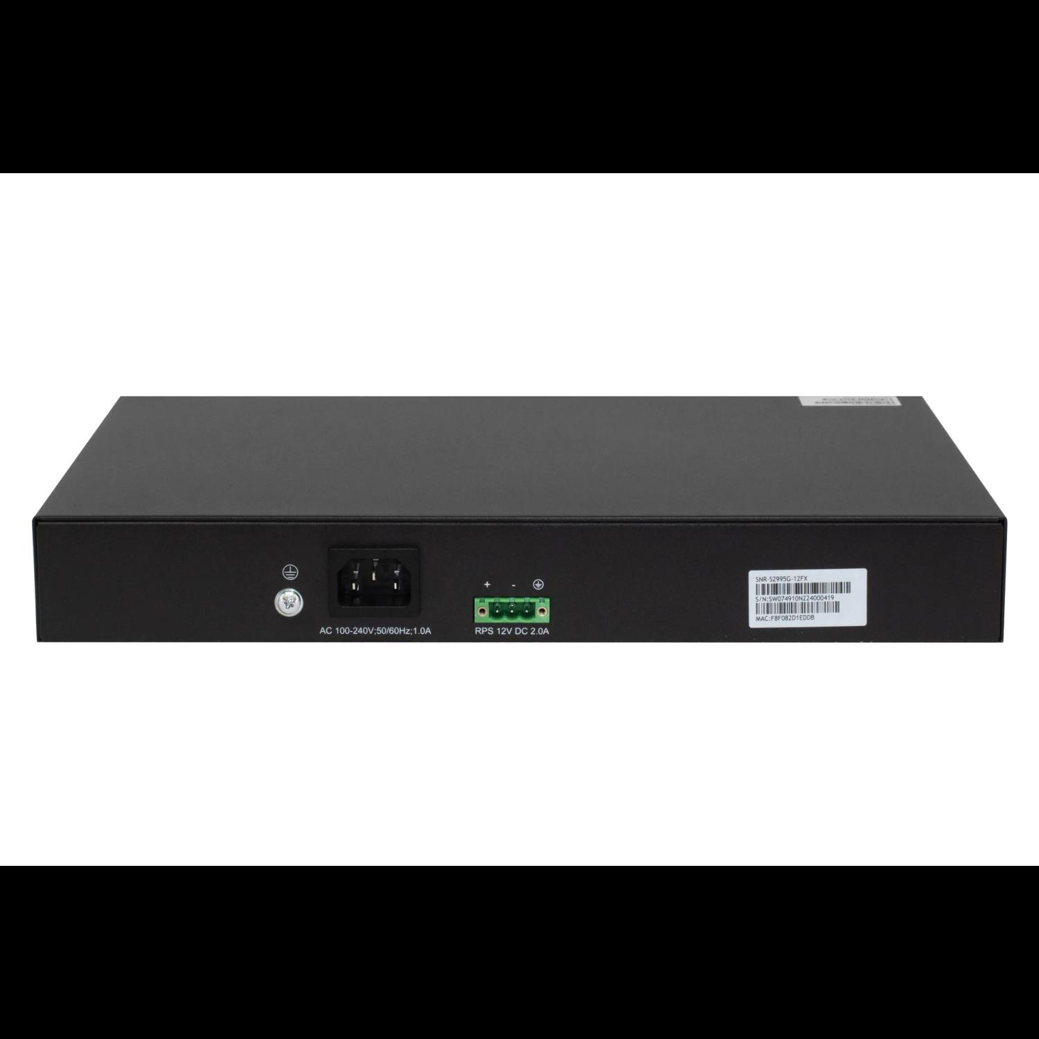 SNR-S2995G-12FX имеет встроенный блок питания 90-264V AC, а также разъем RPS для подключения источника питания 12V DC. Заряд АКБ напрямую от коммутатора не производится. Такое резервирование питания обеспечивает бесперебойную передачу трафика при отключении электроэнергии.