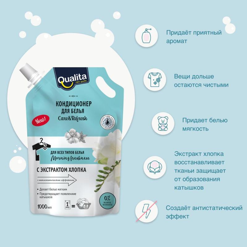 Кондиционер для белья КРИСТАЛЬНЫЙ БРИЗ «QUALITA» обеспечивает безупречную мягкость белья и сохраняет структуру ткани.Эффективная формула с экстрактом хлопка облегчает глажку изделий и избавляет от необходимости пользоваться антистатиком: одежда мягкая, нежная, не электризующаяся после стирки. А тонкий аромат кристального бриза, дарит долгое ощущение свежести и чистоты. Предназначен для изделий из всех типов тканей.