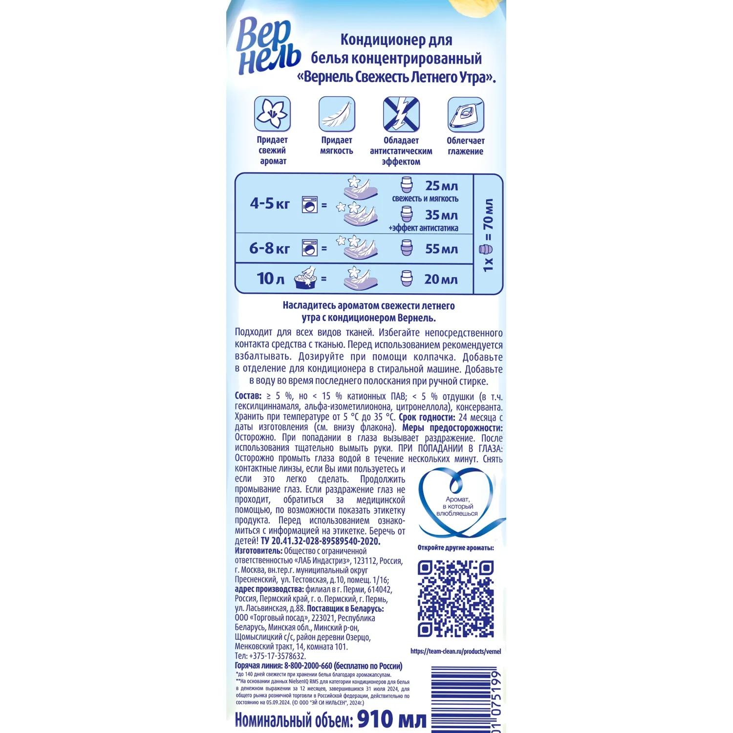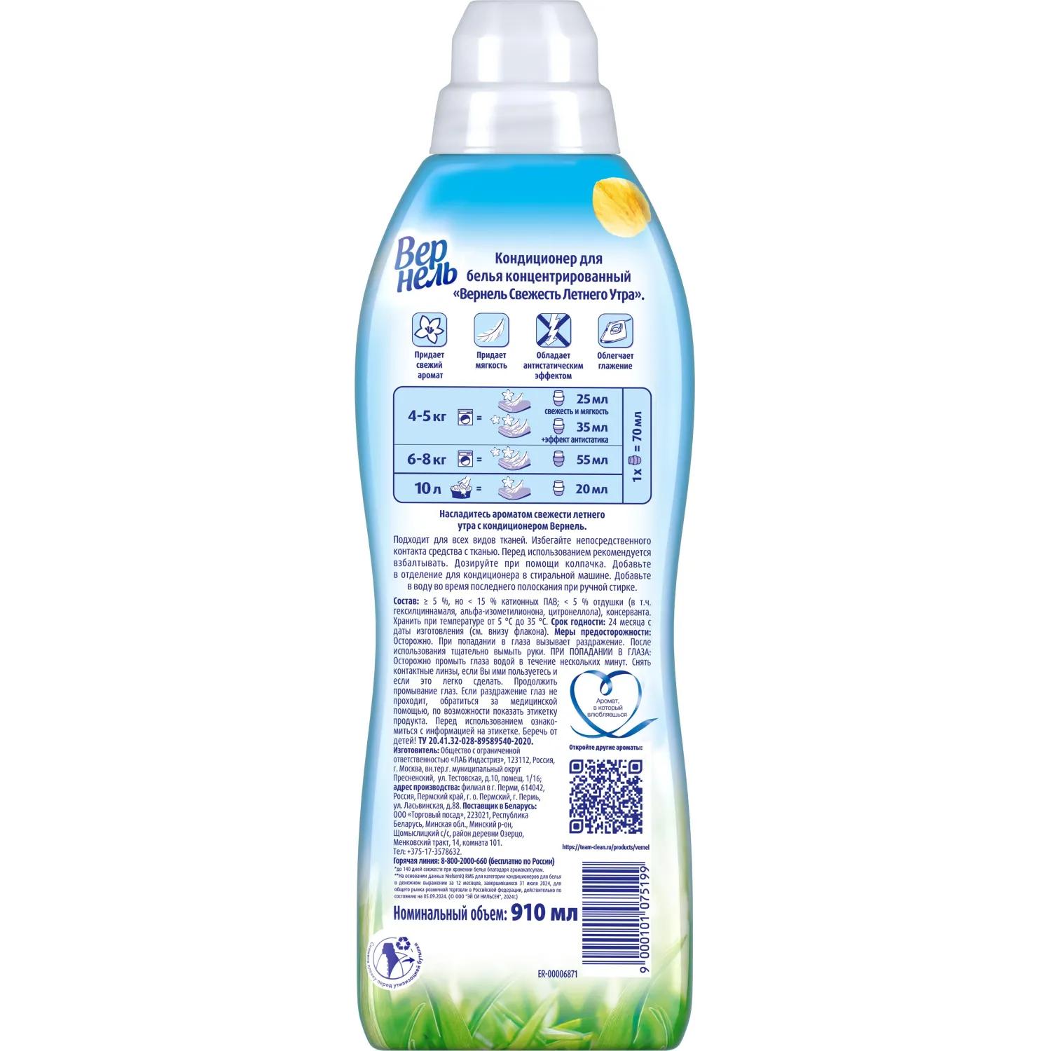 <b>Назначение:</b> кондиционер для белья Вернель Свежесть летнего утра подходит для всех видов тканей. Избегайте непосредственного контакта средства для стирки с тканью.<br><b>Способ применения:</b> перед использованием рекомендуется взбалтывать. Дозируйте при помощи колпачка. Добавьте в отделение для кондиционера в стиральной машине. Добавьте в воду во время последнего полоскания при ручной стирке.<br>1 колпачок — 70 мл.<br>Машинная стирка:<br>4-5 кг: 25 мл (свежесть и мягкость), 35 мл (+эффект антистатика).<br>6-8 кг: 55 мл.<br>Ручная стирка: 20 мл. Добавьте в воду во время последнего полоскания. Избегайте непосредственного контакта средства с тканью.<br><b>Меры предосторожности:</b> осторожно! При попадании в глаза вызывает раздражение. После использования тщательно вымыть руки. При попадании в глаза: оторожно промыть глаза водой в течении нескольких минут. Если раздражение глаз не проходит, обратиться за медицинской помощью, по возможности показать этикетку продукта. Перед использованием ознакомиться с информацией а этикетке. Беречь от детей!<br><b>Состав:</b> ≥5 %, но <15 % катионных ПАВ, <5 % отдушки (в т.ч. гексилциннамаля, альфа-изометилионона, цитронеллола), консерванта.<br><b>Условия хранения:</b> хранить при температуре от 5°C до 35°С.<br><b>Срок годности:</b> 24 месяца с даты изготовления.