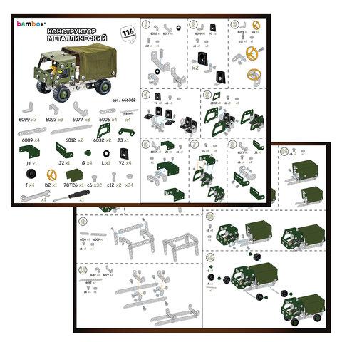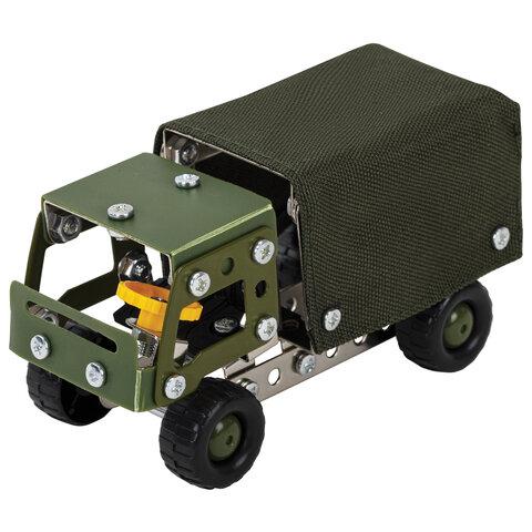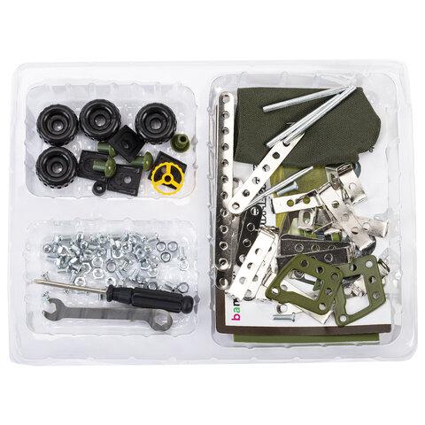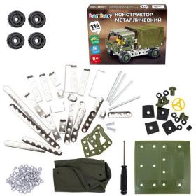 Металлический конструктор BAMBOX "Военный грузовик" –– развивающая игрушка для детей старше 8 лет. Конструктор идеально подходит для занятий на уроках труда и комплексного развития ребёнка.Каждый элемент металлического конструктора BAMBOX "Военный грузовик" продуман до мелочей. Круглые отверстия упрощают соединение деталей, а набор инструментов позволяет надежно закрепить их винтами и гайками.