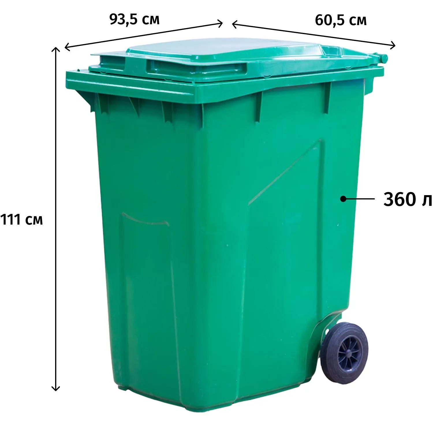 Контейнер-бак мусорный 360 л на колёсах с крышкой пластик зелёный (111×60.5×93.5 см)<br><br>Передвижной мусорный контейнер обладает значительным объёмом для хранения бытовых и промышленных отходов. Два больших прорезиненных колеса диаметром 200 мм обеспечивают мобильность изделия, а прочный пластик гарантирует длительный период использования и значительную нагрузку. Контейнер оснащён герметичной крышкой, диаметром 91×57 см, что исключает распространение запахов. Подходит для раздельного сбора мусора. Контейнер оснащён усиленной передней гребёнкой для работы с мусоровывозящей техникой. Есть ручки.<br><br>Изготовлен из полиэтилена высокой плотности низкого давления (HDPE). <br><b>Используемый материал характеризуется:</b> лёгкостью, высокой прочностью, устойчивостью к выцветанию, к воздействию агрессивных химических веществ, к перепадам температур; возможно использование при низких и высоких температурах (от 40 до 60 °С).<br><b>Высота контейнера-бака:</b> 111 см (с крышкой), 107 см (без крышки).<br><b>Размер по верхней кромке:</b> 93.5×60.5 см.<br><b>Размер дна:</b> 43×54 см.<br><b>Размер крышки:</b> 88×57 см.<br><b>Цвет:</b> зелёный. Оттенок цвета может отличаться в зависимости от партии товара.<br><b>Вес:</b> 14.6 кг.<br><br>Внимание! Поставляется в разобранном виде.<br><br>Внимание: в характеристике «Объём рекомендуемого мешка» указан минимальный объём мешка, который подойдёт для изделия. Рекомендуется приобретать мешки указанного, либо большего объёма.