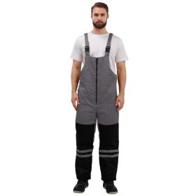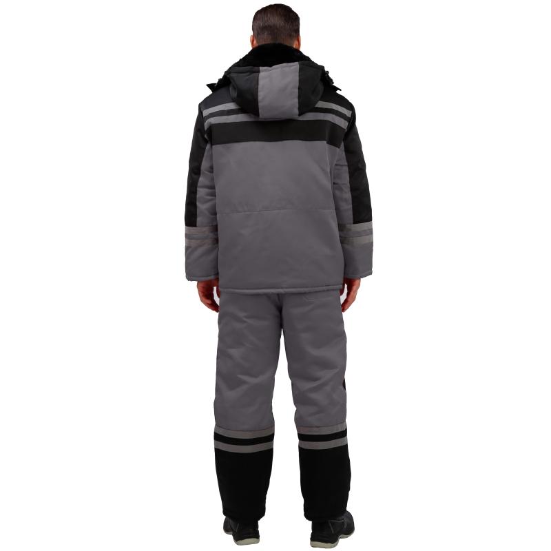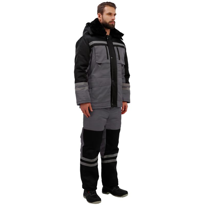 Костюм рабочий зимний мужской з03-КПК с СОП серый/чёрный (размер 48-50, рост 170-176) <br /><br />Рекомендован для использования в сельском хозяйстве, логистике, лёгкой промышленности, строительстве. <br /><br />Ткань верха: смесовая, 80% ПЭ, 20% хлопок, плотностью 190 г/кв.м <br />Водоотталкивающая отделка. <br />Материал подкладки 60 г/кв.м, 100% ПЭ. <br />Утеплитель плотностью 360 г/кв.м (полочка, спинка) и 240 г/кв.м (рукава, полукомбинезон). <br />Мех 600 г/кв.м, 100% ПЭ (воротник). <br /><br />Технология изготовления термоскреплённого синтепона (евросинтепона) позволяет использовать данный утеплитель для создания более тонких изделий с сохранением термозащитных свойств. Важными преимуществами утеплителя являются лёгкость и хорошая пластичность, что улучшает подвижность в костюме. А также исключение миграции волокна через ткани верха и подкладки за счёт скрепления слоев. <br /><br />Куртка прямого силуэта с застёжкой на молнию, две ветрозащитные планки на кнопках. Верхние накладные карманы с объёмом и входом на молнию; под карманами полукольца. Нижние объёмные накладные карманы с клапанами. Регулировка объёма куртки по линии талии со стороны подкладки при помощи шнура и фиксаторов. Съёмный капюшон на кнопках, с регулируемым объёмом по лицевому срезу при помощи шнура и фиксаторов. Воротник отложной со съёмным меховым воротником на пуговицах. Притачная утепляющая подкладка с накладным карманом на левой полочке и трикотажными напульсниками. <br /><br />Полукомбинезон с застёжкой на молнию. Карманы боковые накладные с наклонным входом, на правой задней половинке дополнительный карман накладной карман. Спинка с кулиской из эластичной ленты. Бретели с эластичной лентой и фиксируются на фастексы. <br /><br />Светоотражающая лента: ширина 25 мм, 150 кнд, в один ряд, на полочке, спинке. В два ряда на рукавах, полукомбинезоне. <br /><br />Температурный диапазон: до — 18°С. Климатический пояс: III. Класс защиты: 2. <br /><br />Защитные свойства: <br />Тн — от пониженных температур <br />З — от общих производственных загрязнений <br /><br />Соответствует ГОСТ 12.4.303-2016, ТР ТС 019/2011 <br /><br />Подобрать размер <br /><br />Цвет на изображении товара в интернет-магазине или в печатном каталоге может отличаться от оригинала из-за особенностей цветопередачи монитора.