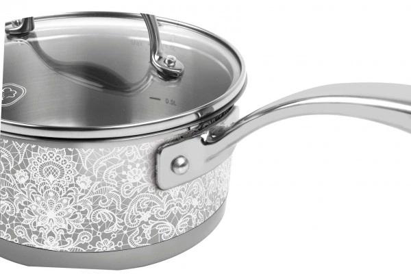 | Описание | Поверхности кастрюль, ковша, френч-прессов, изготовленных из высококачественной нержавеющей стали, украшает изысканный кружевной узор, выполненный по технологии жидкостекольной деколи (на ручках столовых приборов для его создания применялась лазерная гравировка). |