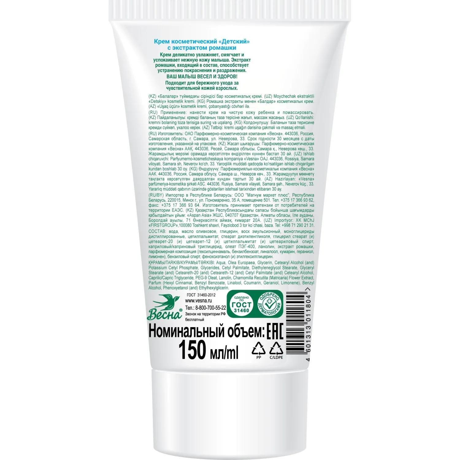 Крем детский Весна Успокаивающий 150 мл<br><br>Крем — натуральный, безопасный продукт для детей с первых дней жизни по доступной цене. Благодаря специальной формуле на основе оливкового масла и экстракта ромашки, крем способствует устранению покраснения и раздражения, бережно ухаживая за нежной кожей малыша. Эффективен при решении специфических проблем кожи (высыпания, покраснения, шелушения).<br>Имеет гипоаллергенный состав и подходит для применения с первых дней жизни.<br>Состав: вода, масло оливковое, глицерин, воск эмульсионный, моноглицериды дистиллированные, цетилпальмитат, стеарат диэтиленгликоля, лицерил стеарат (и) цетеарет-20 (и) цетеарет-12 (и) цетилпальмитат (и) цетеариловый спирт, каприловый/каприновый триглицерид, олеат ПЭГ-400, ланолин, экстракт ромашки, парфюмерная композиция (гексилциннамаль, бензилбензоат, линалоол, кумарин, гераниол, лимонен), бензиловый спирт, феноксиэтанол (и) этилгексилглицерин.