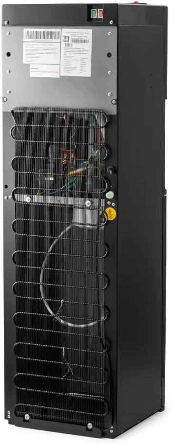 Кулер охлаждает воду до 9°С компрессорным способом со скоростью 2 л/час. Тэн мощностью 800 Вт обеспечивает нагрев жидкости до 95°С, производительность — 6 л/час. Устройство управляется с помощью трех клавиш-помп, каждая из которых отвечают за отдельный краник. Панель со светодиодными индикаторами позволяет контролировать процесс работы. Прибор относится к B-классу энергоэффективности, так как экономично потребляет электричество.